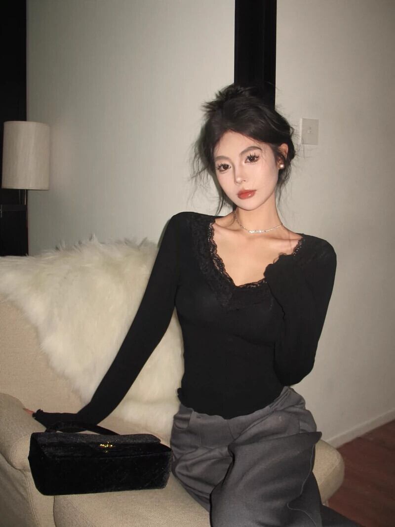 春のブラックレースVネックTシャツレディース、ウエストスリム、タイトフィット長袖インナートップと純粋な欲望スタイルのボトリングシャツ ロング スプリング 春物 ピュア berry4030980286 | beaute25
