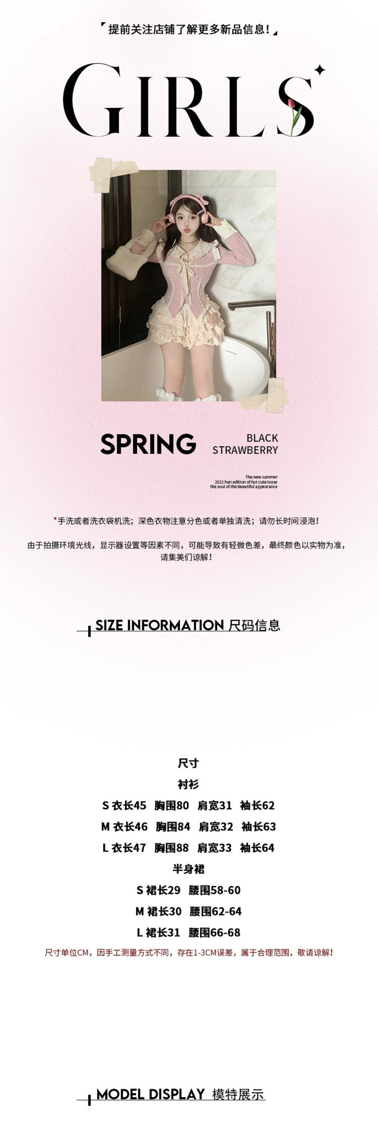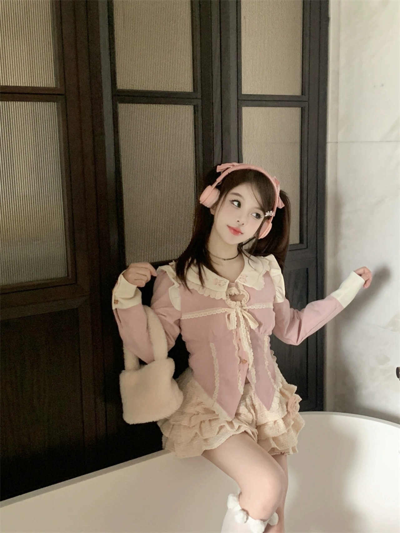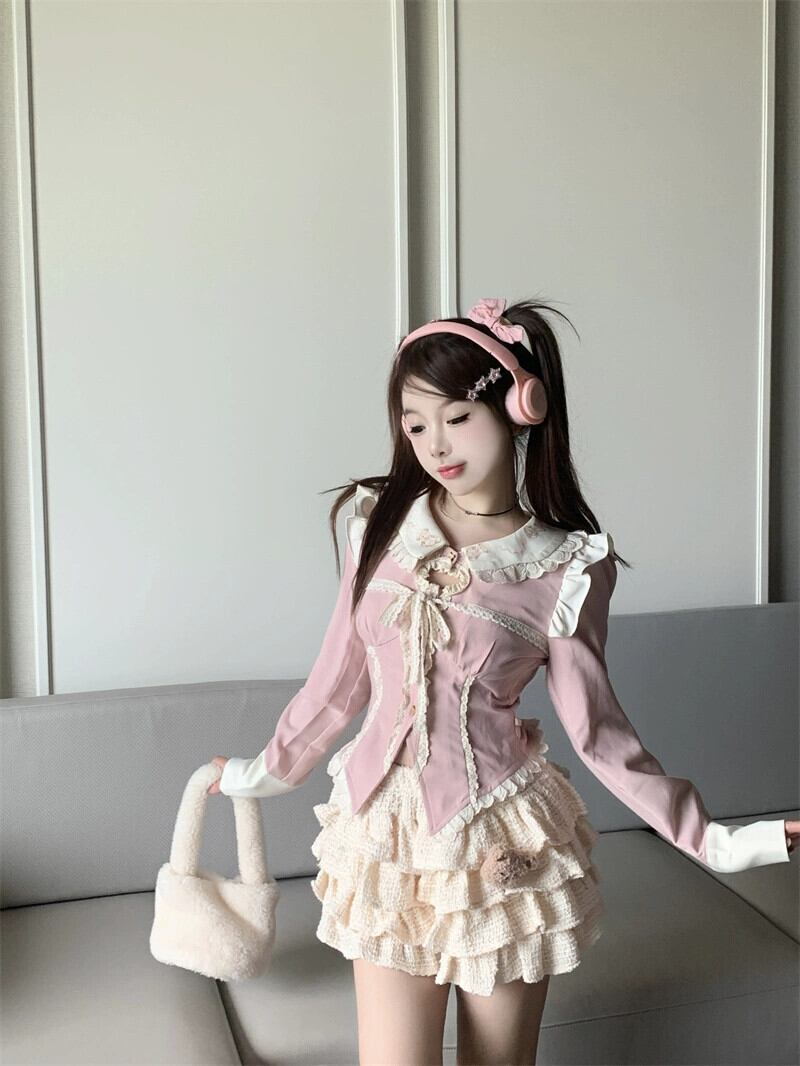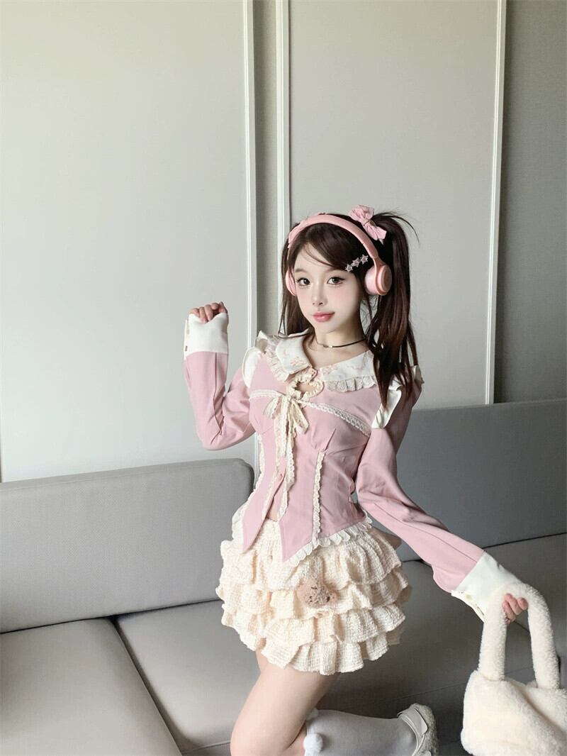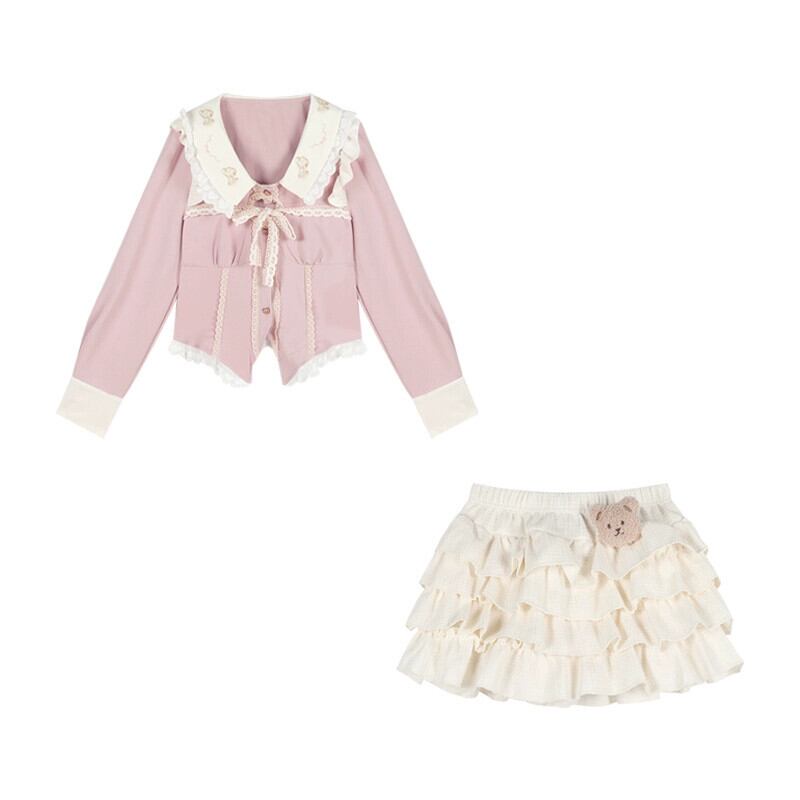 小さな甘いスーツピンクの人形の襟長袖シャツ女性春ケーキスカート胸かわいい 2 点セット ロング 大人ガーリー スウィート キュート カジュアル スプリング 春物 berry26623404 | beaute25