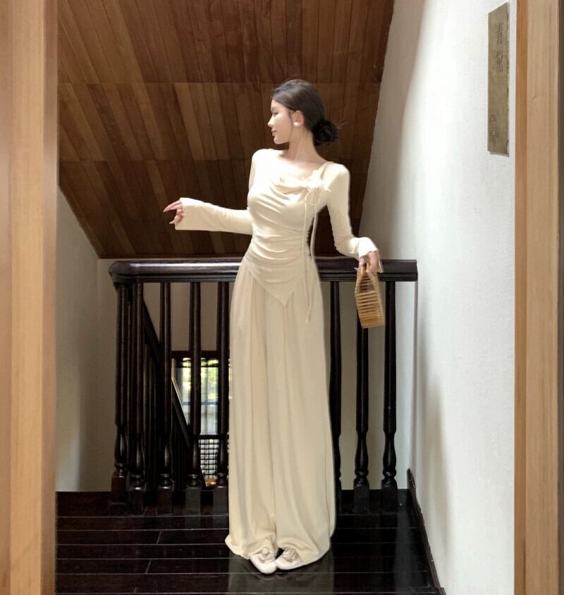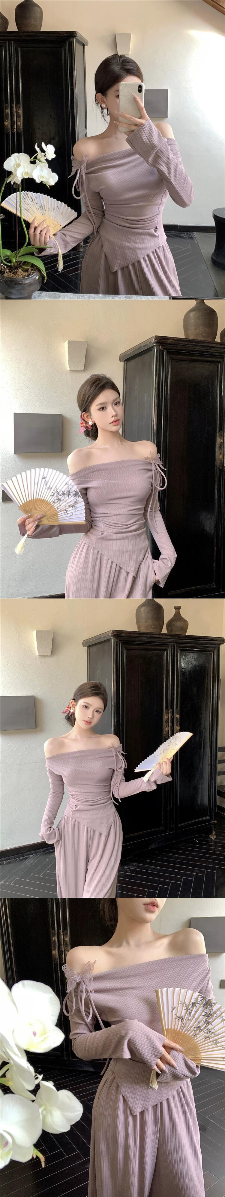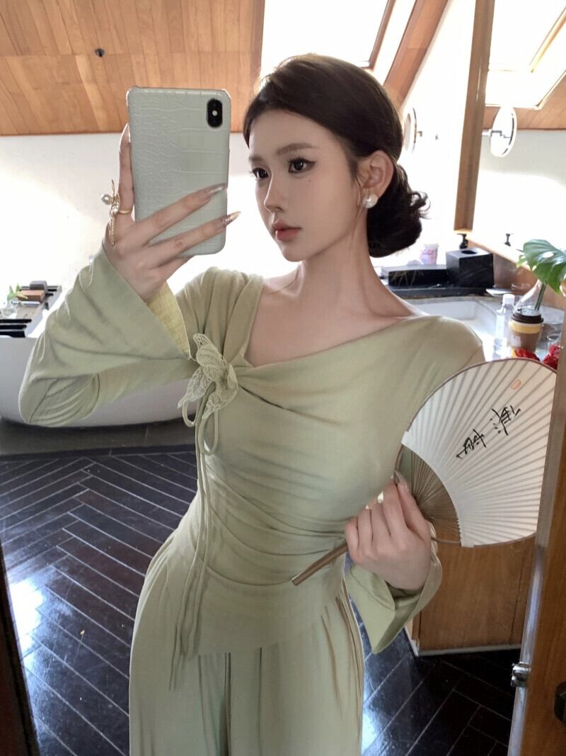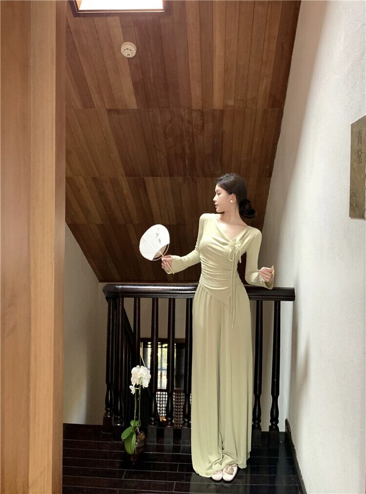レースアップリボン長袖スイングカラー Tシャツトップ女性春の新作チャイナスーツカジュアルワイドレッグパンツ 2 点セット ロング スプリング 春物 berry14994825222 | beaute25
