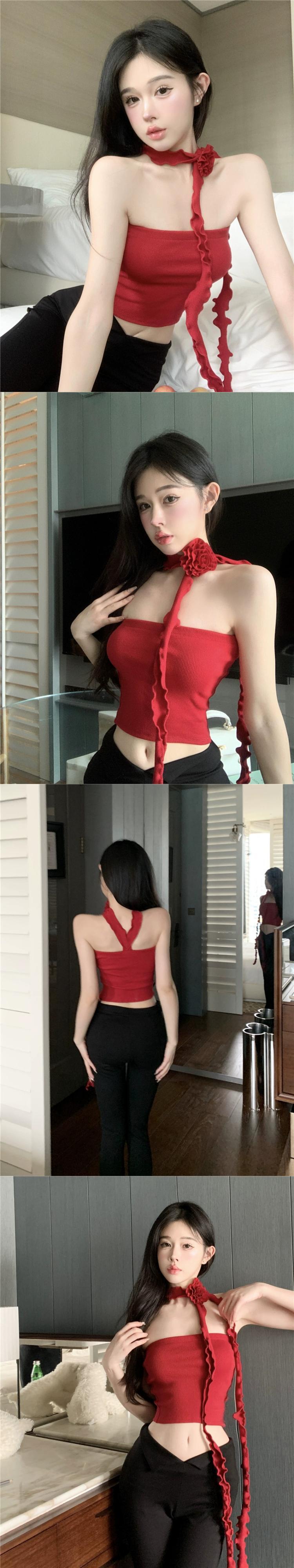 夏の赤いストリーマー ホルターネック キャミソール女性花タイトでセクシーなインナー トップとアウター ボトム シャツ レッド サマー 夏物 フラワーデザイン berry46331968737 | beaute25