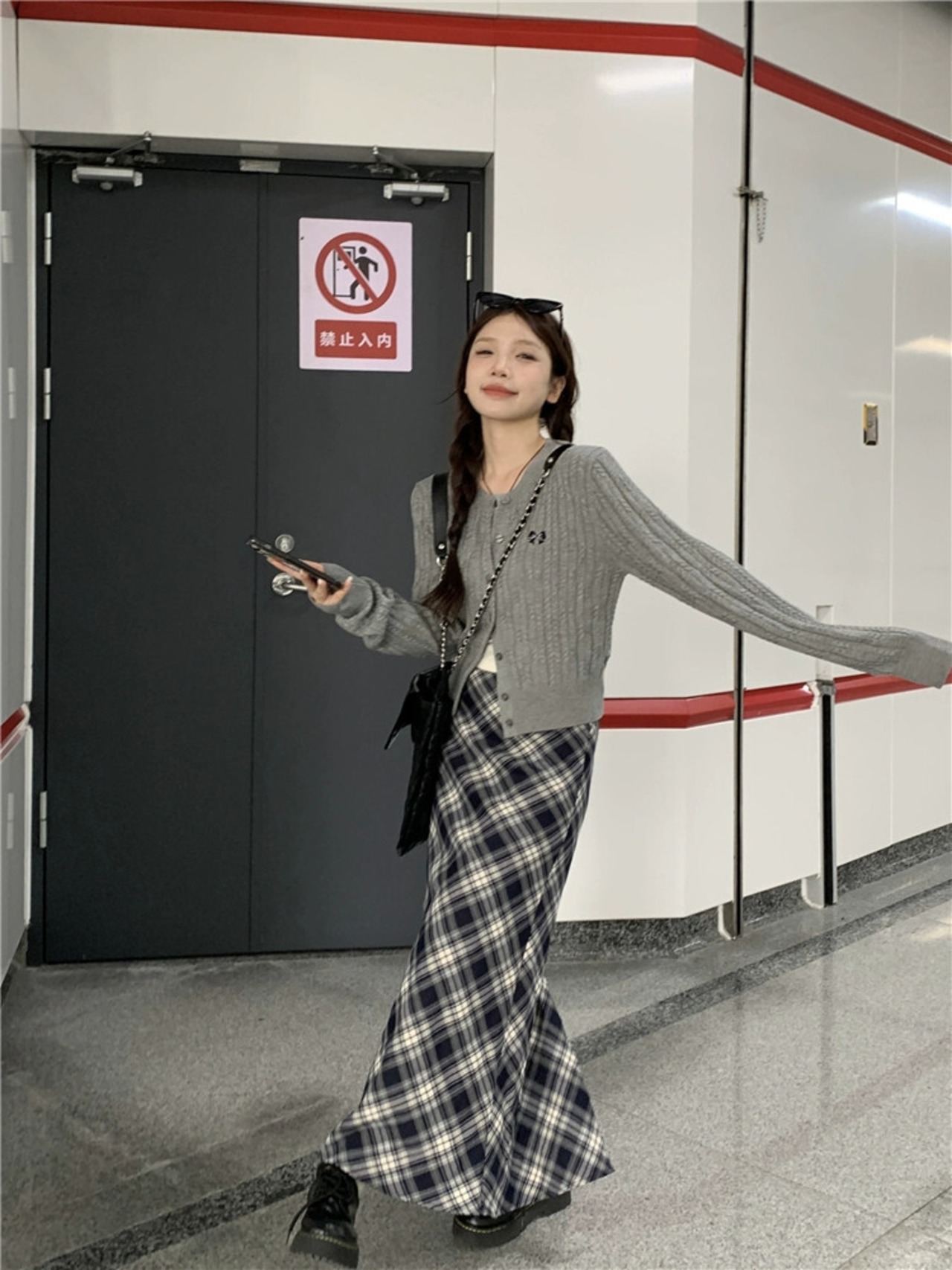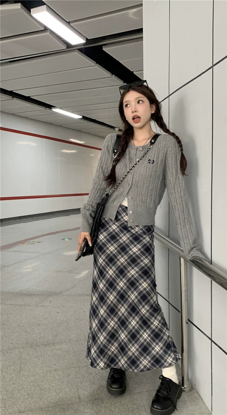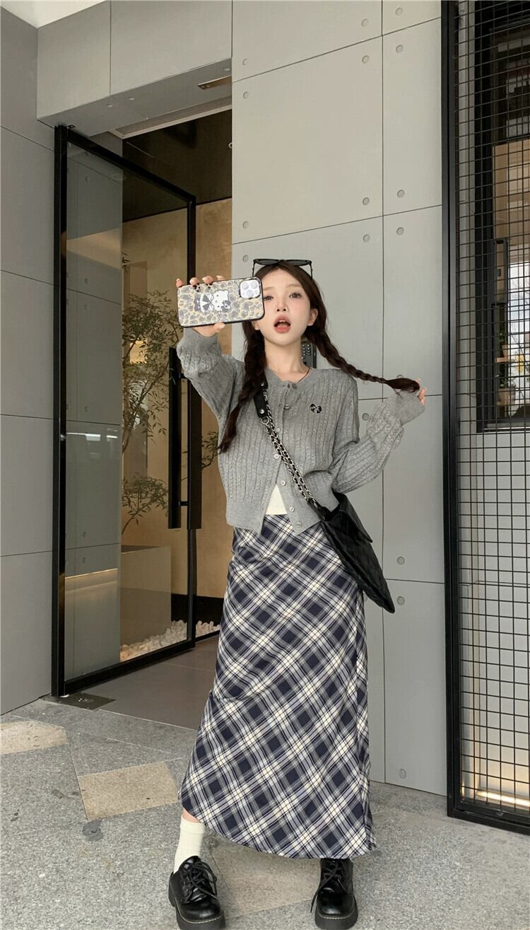 色:白いベスト,グレーのカーディガン,青い格子縞のスカート