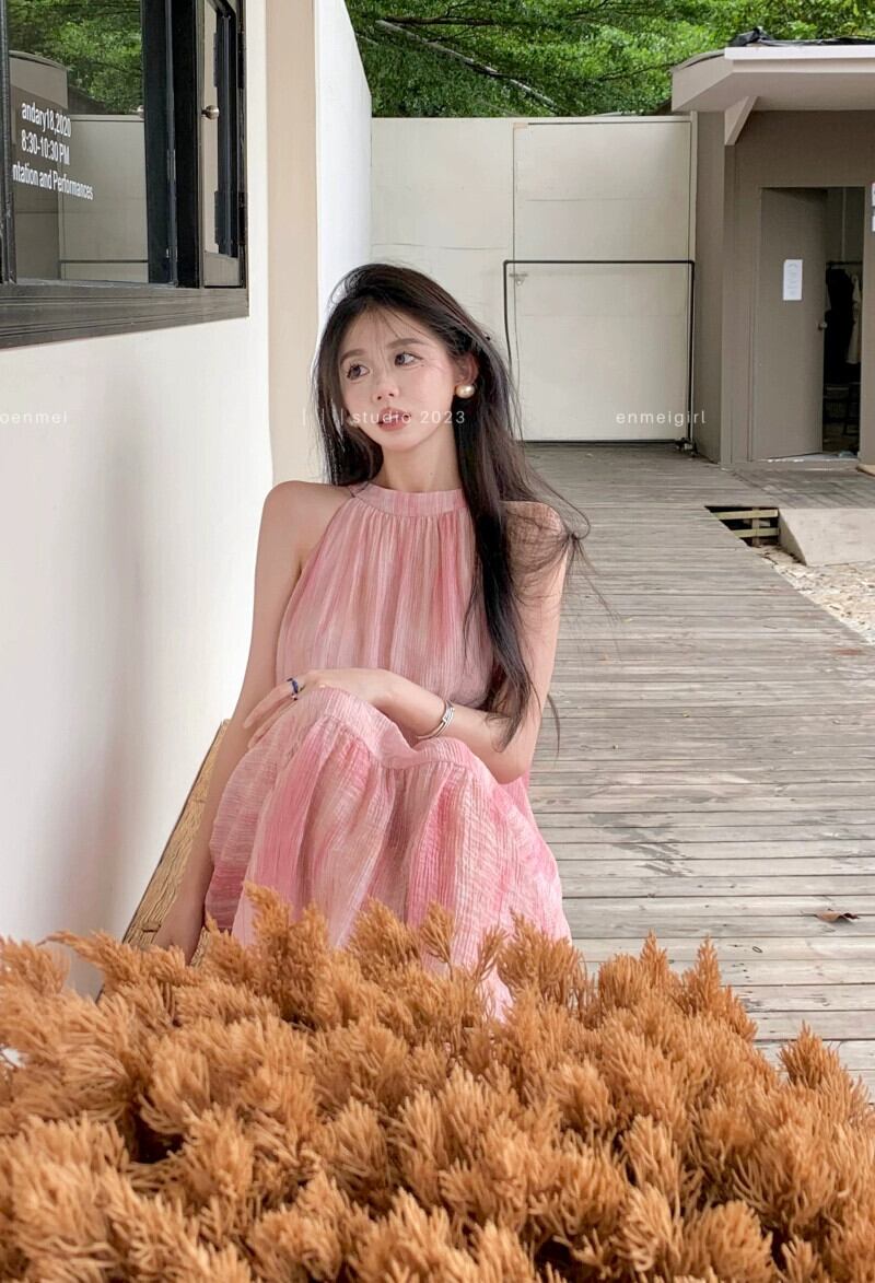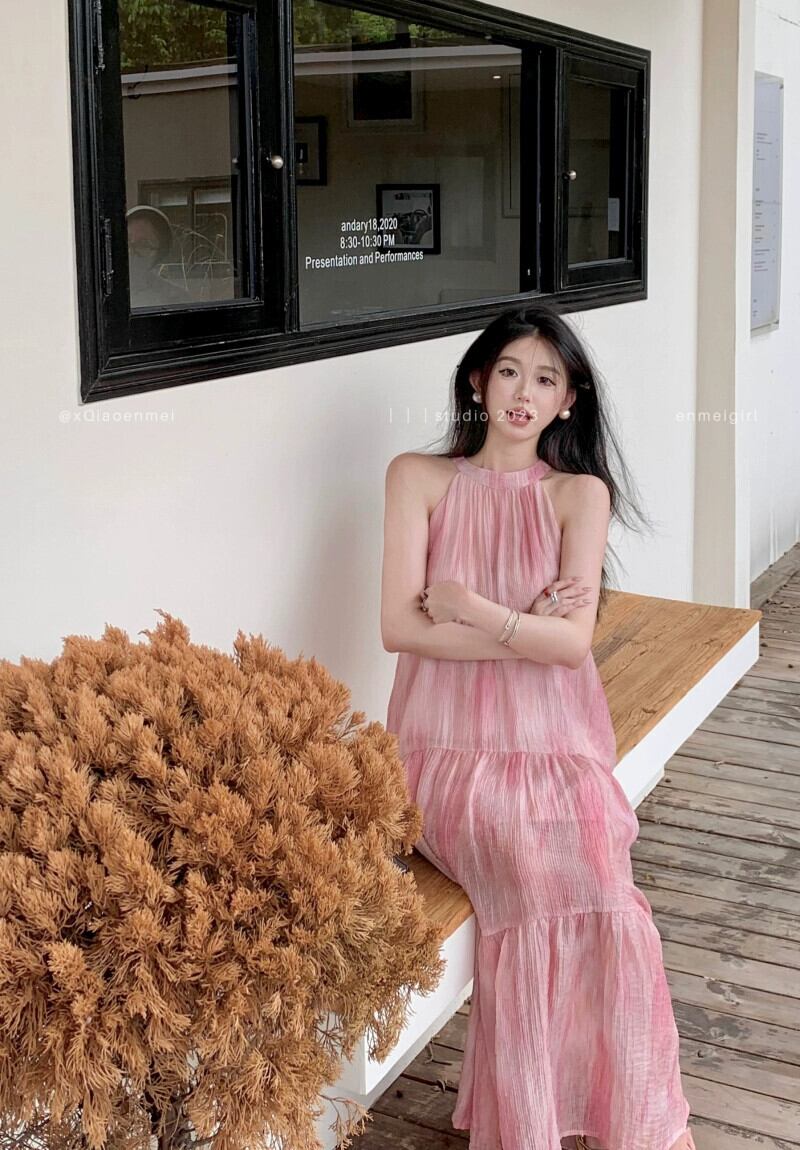 フレンチスタイルの見事なホルターネックドレスの女性、夏のミッドレングススカートの小人、ピンクのユニークなノースリーブの海辺の絞り染めスカート サマー 夏物 berry42290422583 | beaute25
