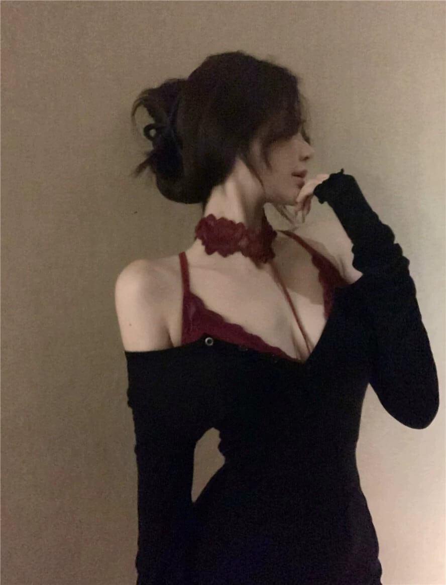 黒のセクシーなワンショルダー長袖 Tシャツ女性春ウエストタイトな不規則なレースのインナートップと純粋な欲望のスタイル ロング ブラック スプリング 春物 ピュア berry32090820894 | beaute25