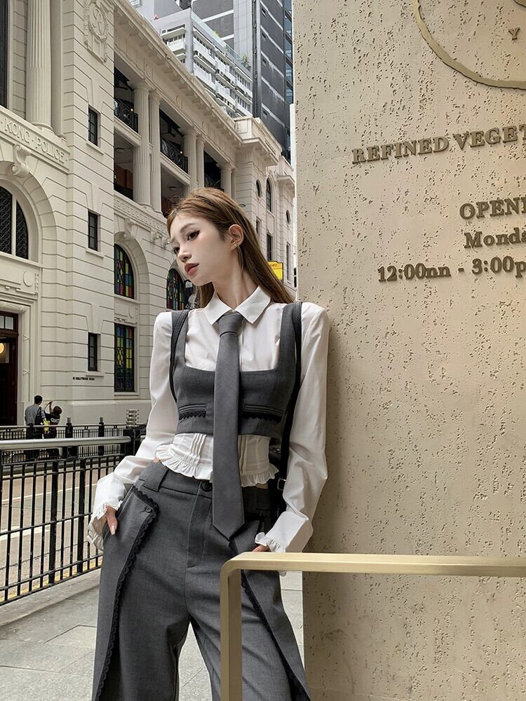 色:グレーのベスト,白のシャツ,グレーパンツ,ネクタイ