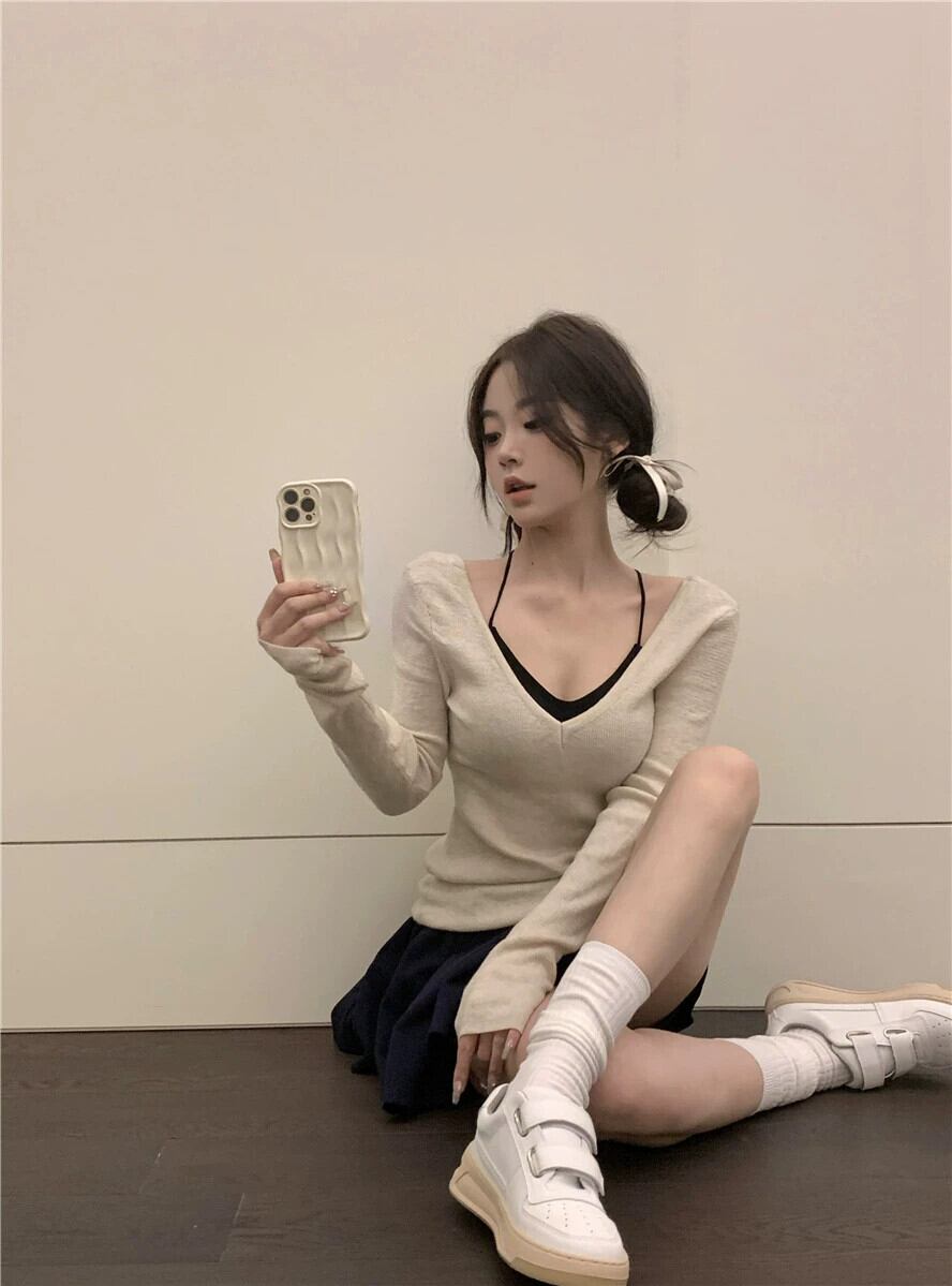 V ネック長袖ニット T シャツの女性春の純粋な欲望スリム ボトム シャツとバレエ スタイルのシックなシックなブラウス トップ ロング スプリング 春物 Vネック Tシャツ ピュア berry15968634030 | beaute25