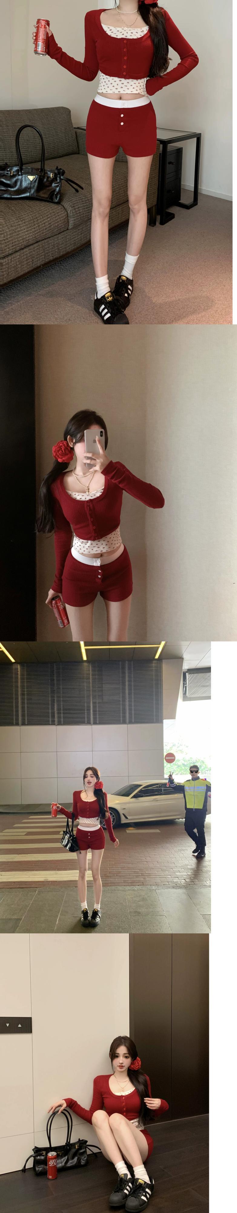 年赤スーツ レディース 春 長袖 ショート ニット カーディガン 花柄 キャミソール トップ ショーツ 3点セット ロング レッド スプリング 春物 ブルマー berry39887632267 | beaute25