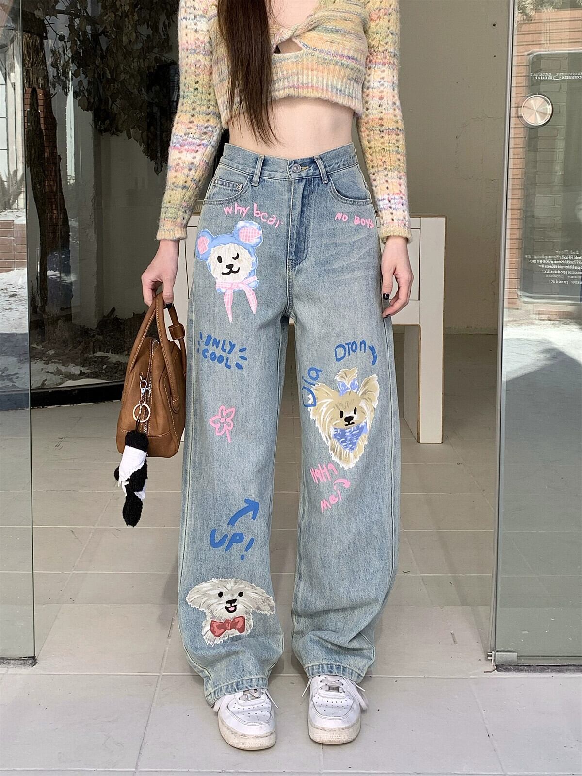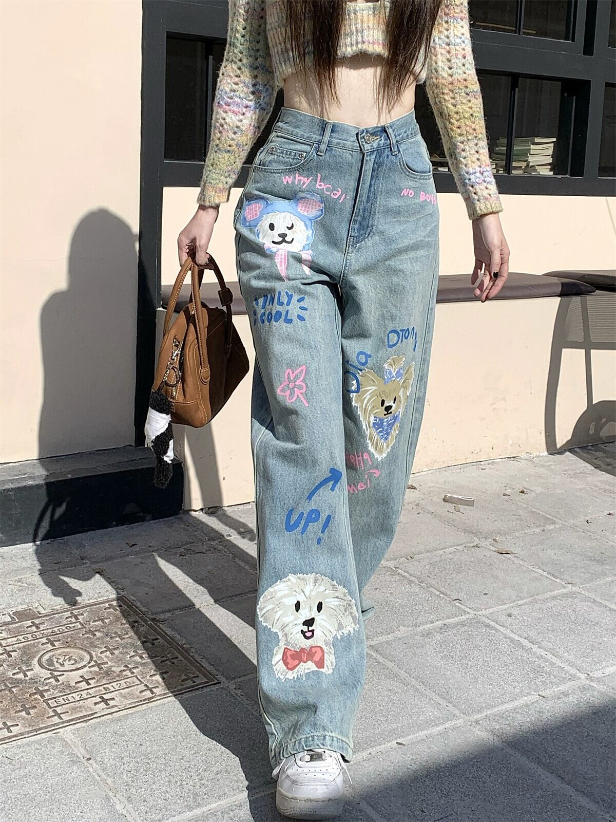 漫画の落書きプリントワイドレッグジーンズ女性の夏ルーズハイウエストスリムストレートパンツカジュアルフロアモップパンツ ハイウェスト サマー 夏物 ワイドパンツ berry50335700388 | beaute25