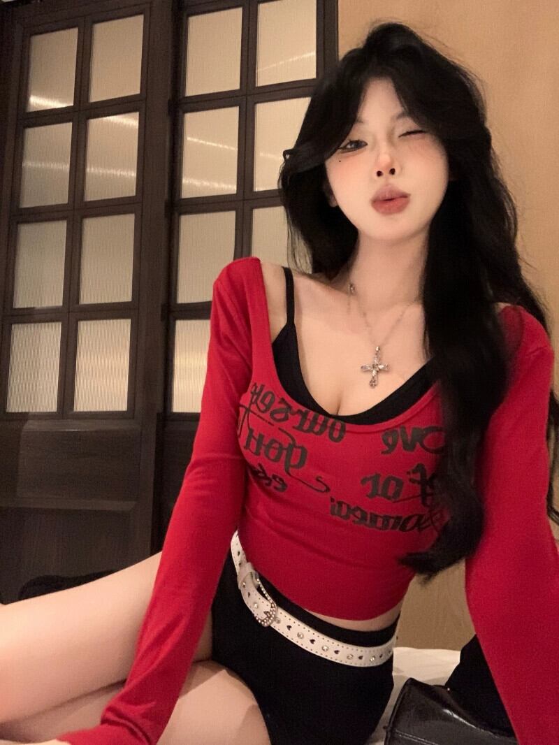 純粋な欲望ホットガールレッドスクエアネック長袖 Tシャツ女性の春のセクシーなスリムショートレタープリントトップボトリングシャツ ロング スプリング 春物 スクウェア berry1741154636 | beaute25