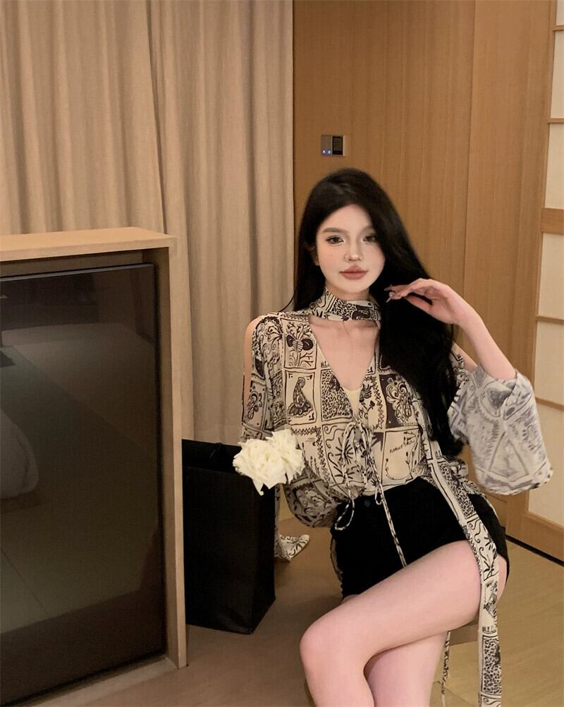 黒の V ネック中空オフショルダー長袖シフォンシャツ女性春肩肩シャツサスペンダー重ね着トップ 2 点セット ロング ブラック スプリング 春物 Vネック berry93617299476 | beaute25