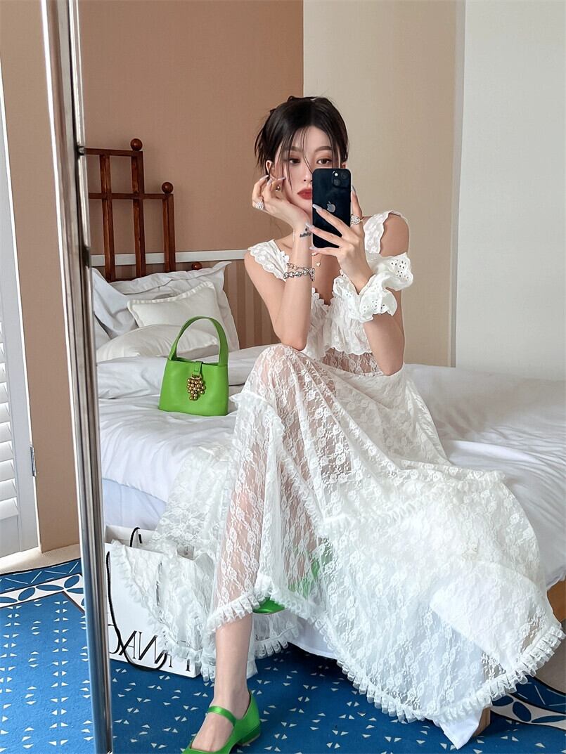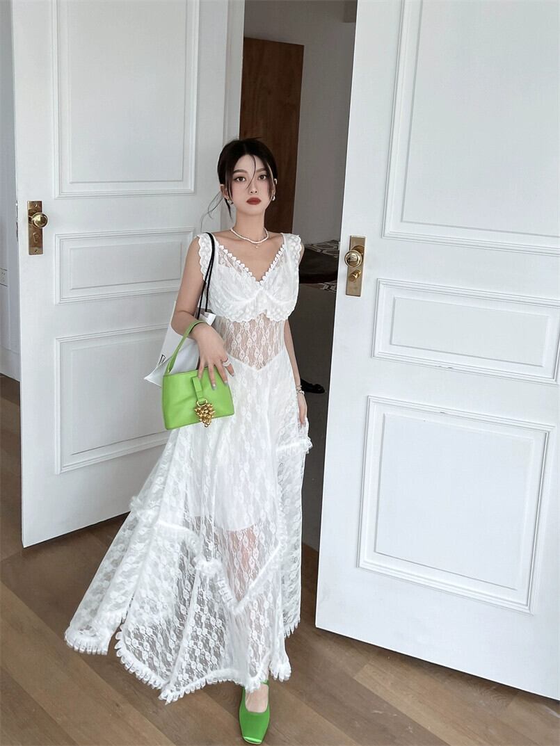 白いレースのサスペンダードレスの女性の夏薄いシースルー甘いベストスカートセクシーな気質vネックロングスカート ホワイト 大人ガーリー スウィート キュート カジュアル サマー 夏物 berry63287646264 | beaute25