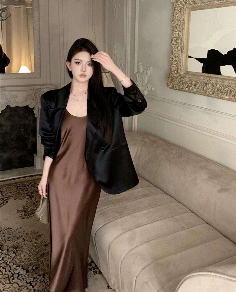 色:茶色のスカート,シャンパンライススカート,黒スカート,黒いジャケット