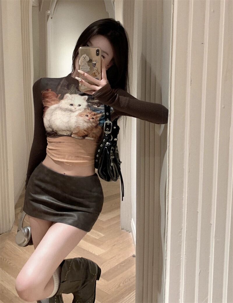 メイラード レトロ ホット ガール キャット プリント 長袖 Tシャツ レディース 秋 スリム ショート スプライス ボトム シャツ トップ ロング オータム 秋物 berry56238630442 | beaute25