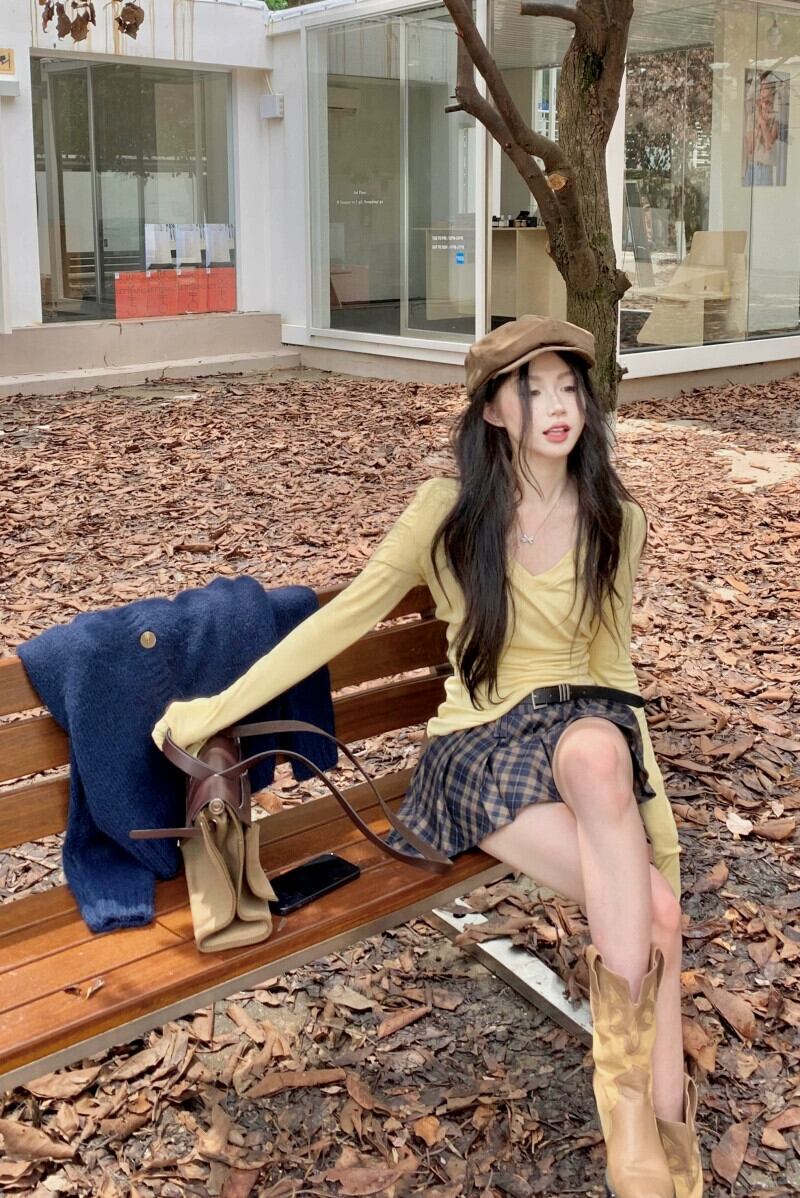 色:ロイヤルブルーコート,チェック柄プリーツスカート,イエローT