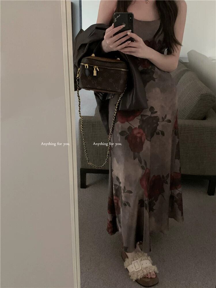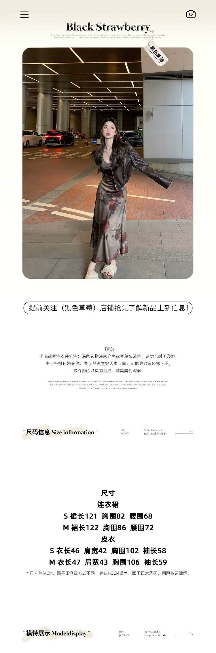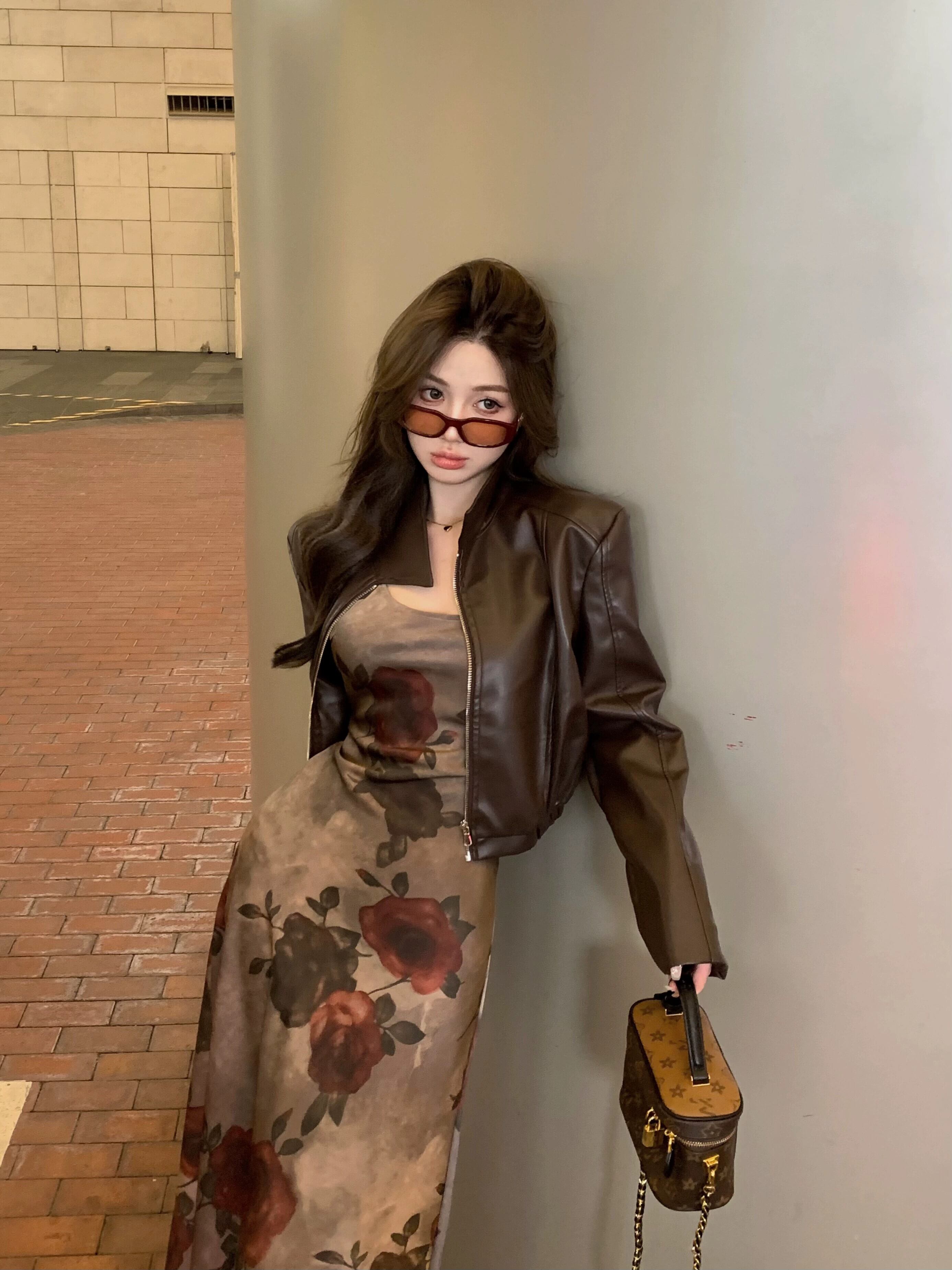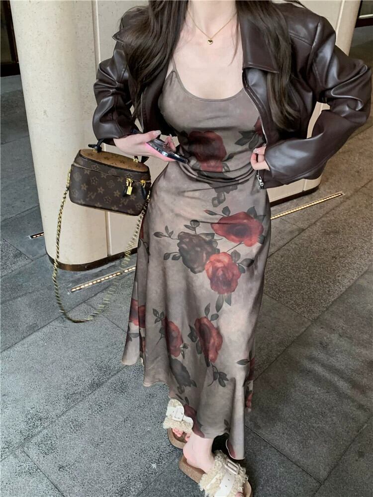 色:バラのドレス,ブラウンレザージャケット