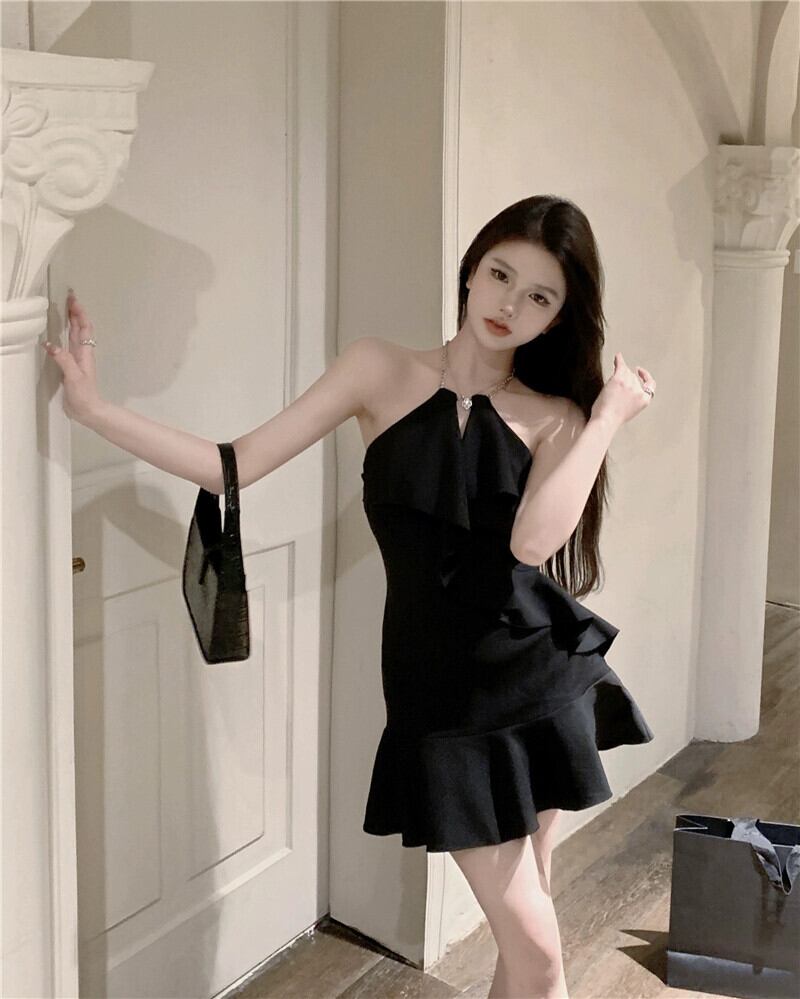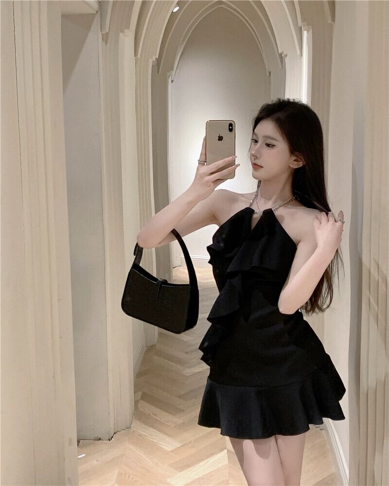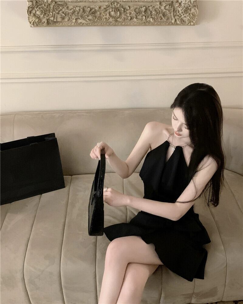 ヘップバーン スタイル チェーン ホルターネック サスペンダー ドレス レディース サマー リトル ブラック ドレス ショート スカート オフショルダー A ライン フリル スカート 夏物 Aライン berry2420387439 | beaute25