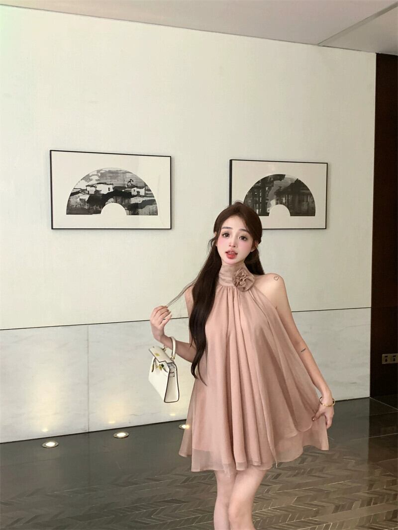 社交界の立体フラワーホルターネックノースリーブドレス妖精夏優しいスタイルフレンチオフショルダースカートショートスカート サマー 夏物 フラワーデザイン berry9600451778 | beaute25