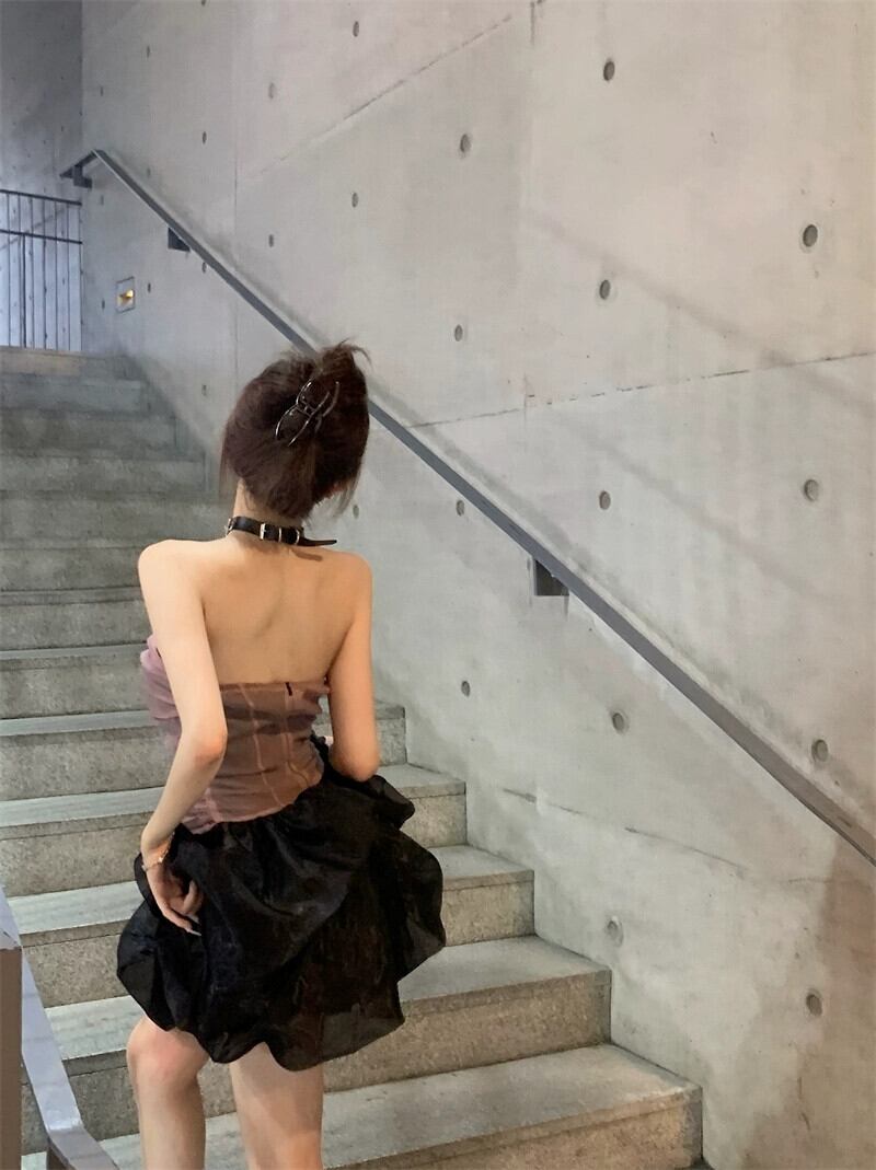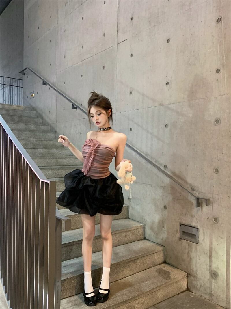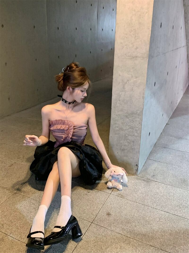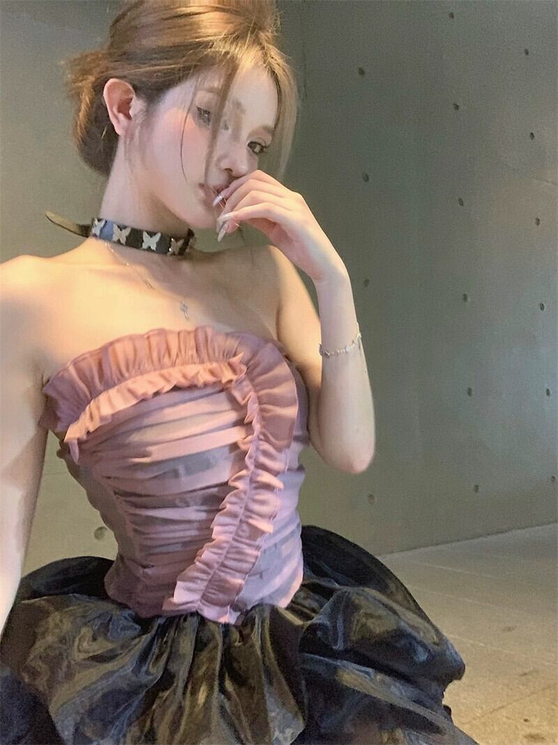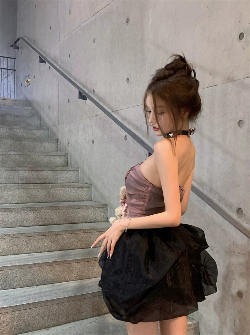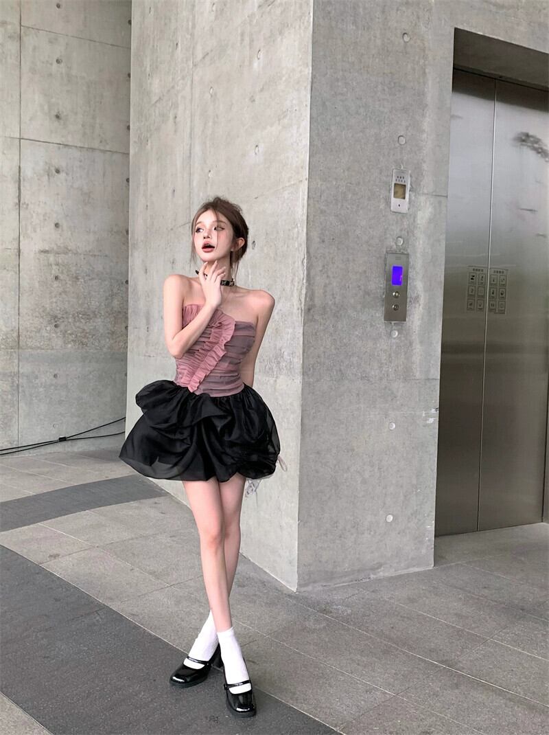 プリーツチューブトップドレス女性の夏のスプライシングセクシーな背中の開いた気質ノースリーブリトルブラックドレスふくらはぎショートスカート サマー 夏物 berry43226104184 | beaute25