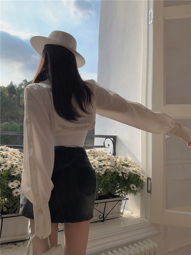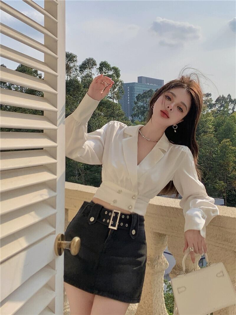 秋冬のフレンチスタイルのラペル長袖シャツ、高級白サテンシャツ、ウエストスリムフィットショートトップ ロング ホワイト オータム 秋物 ウィンター 冬物 berry80655914702 | beaute25