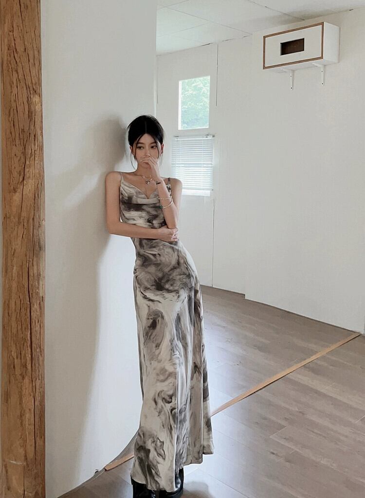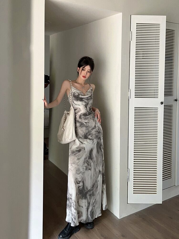 中国風水墨画サスペンダードレス女性の夏フレンチスタイルスイングカラー気質リトルママスカートヒップカバーフィッシュテールロングスカート サマー 夏物 berry13668302226 | beaute25