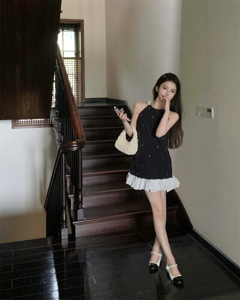 黒ホルターネックサスペンダードレス女性の夏のフランスのハイエンドスカートノースリーブ小さな香りのスタイルの誕生日スプライシングショートスカート ブラック サマー 夏物 berry54292684739 | beaute25