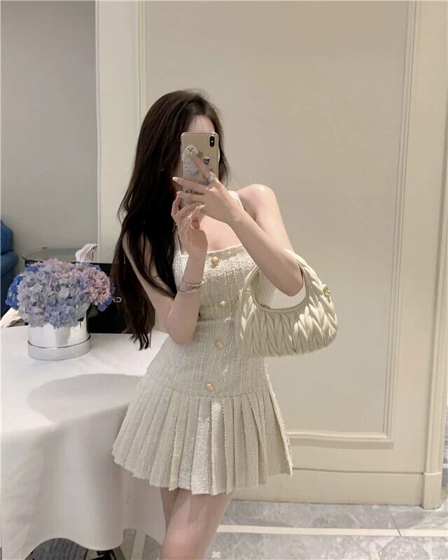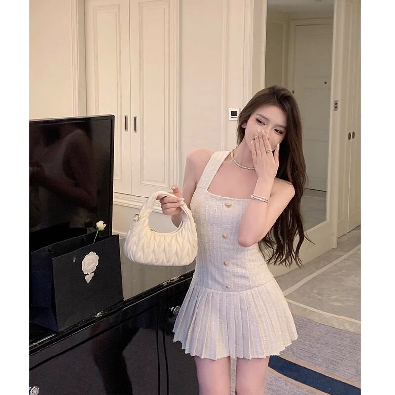 Xiaoxiangfeng ホルターネックサスペンダードレス女性の夏のウエストを締める気質プリーツスカートハイエンドスクエアネック A ラインスカート サマー 夏物 Aライン スクウェア berry78968103975 | beaute25