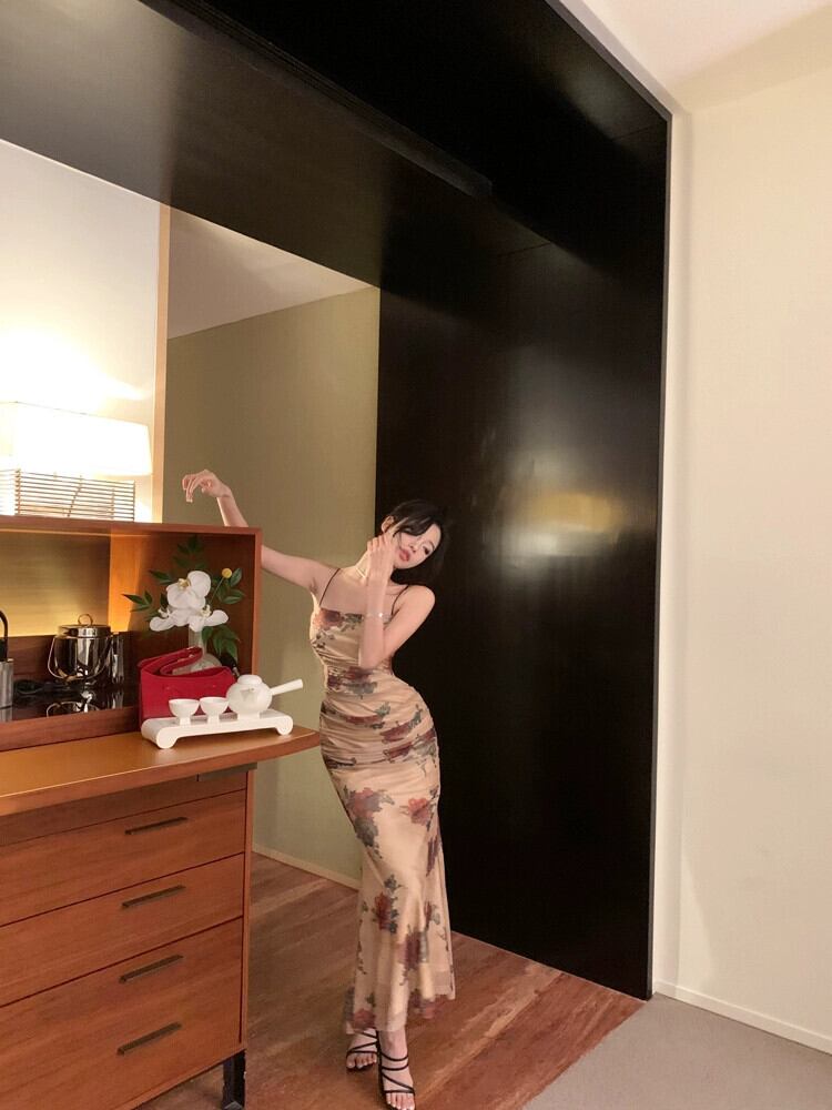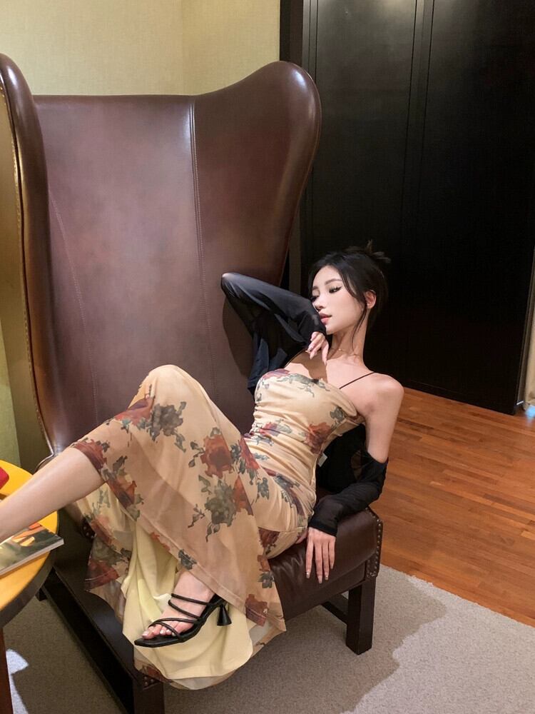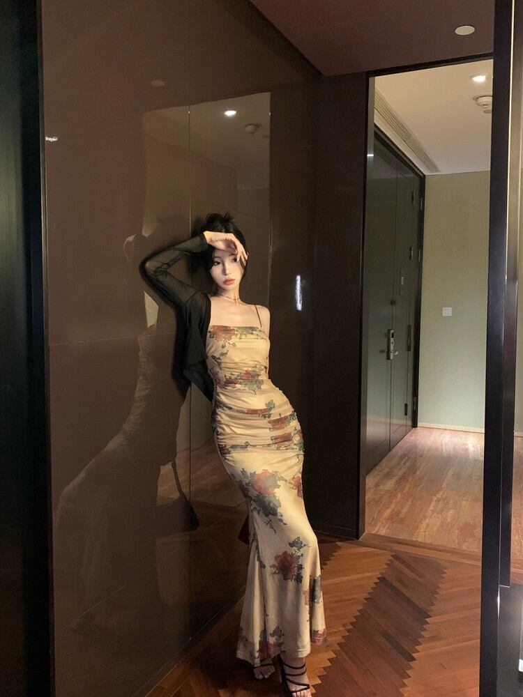 レトロなスタイルのローズ花サスペンダードレス女性の夏のメッシュスカートウエストプリーツヒップハグフィッシュテールロングスカート サマー 夏物 花柄 berry66443941976 | beaute25