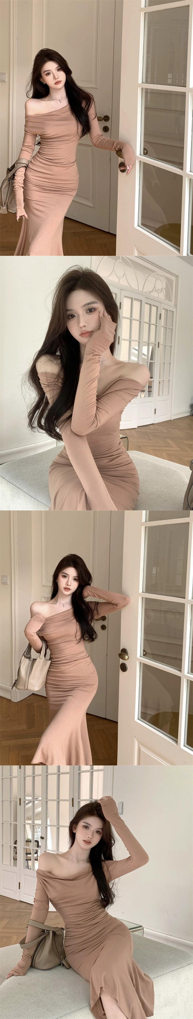 ピンクのオフショルダースリムドレスの女性の春長袖純粋な欲望スカートウエストバッグヒップフィッシュテール不規則なロングスカート スプリング 春物 ピュア berry39567115618 | beaute25