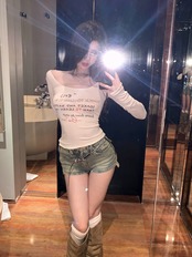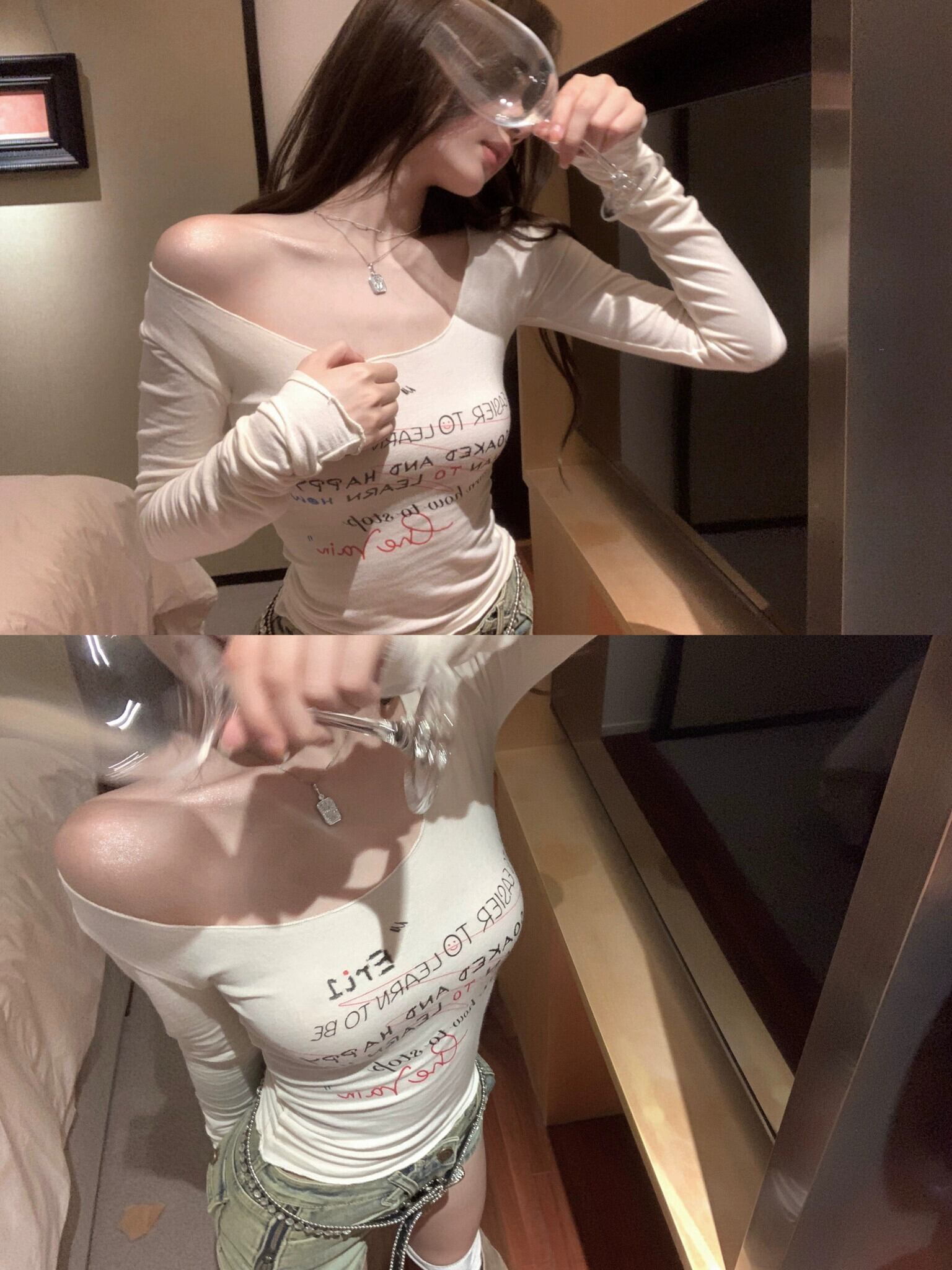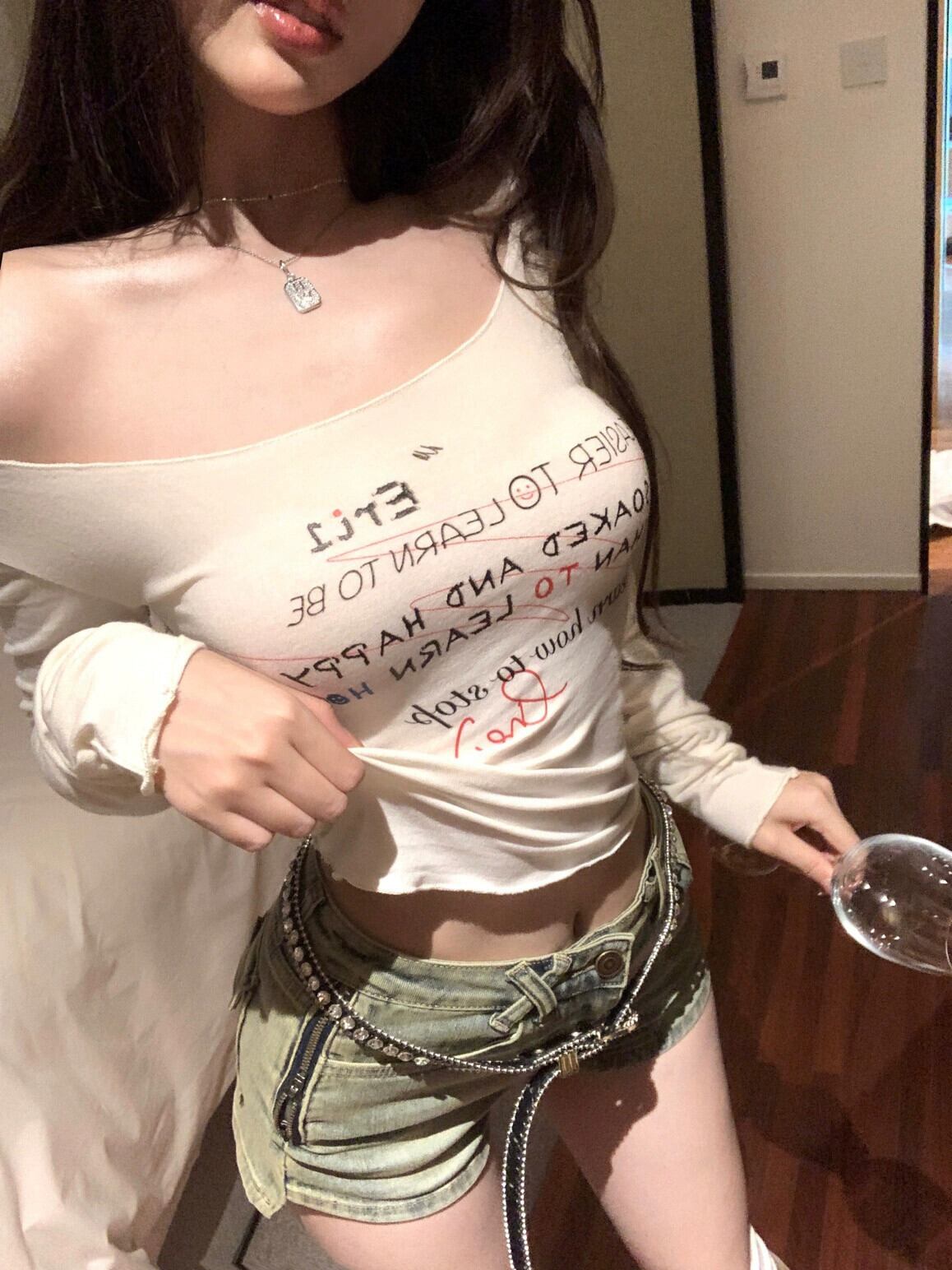 ホワイトレタープリントワンショルダー長袖ボトシャツTシャツレディース秋冬甘いスリムフィットショートインナートップ ロング 大人ガーリー スウィート キュート カジュアル オータム 秋物 ウィンター 冬物 berry535465582 | beaute25