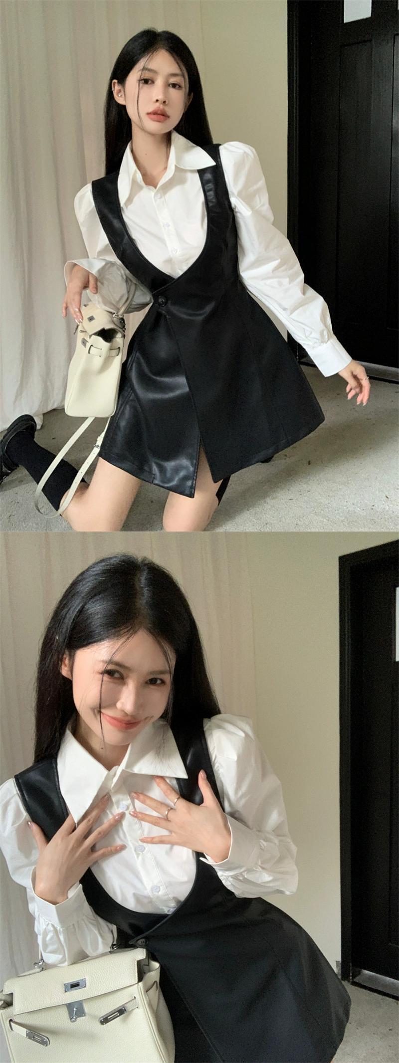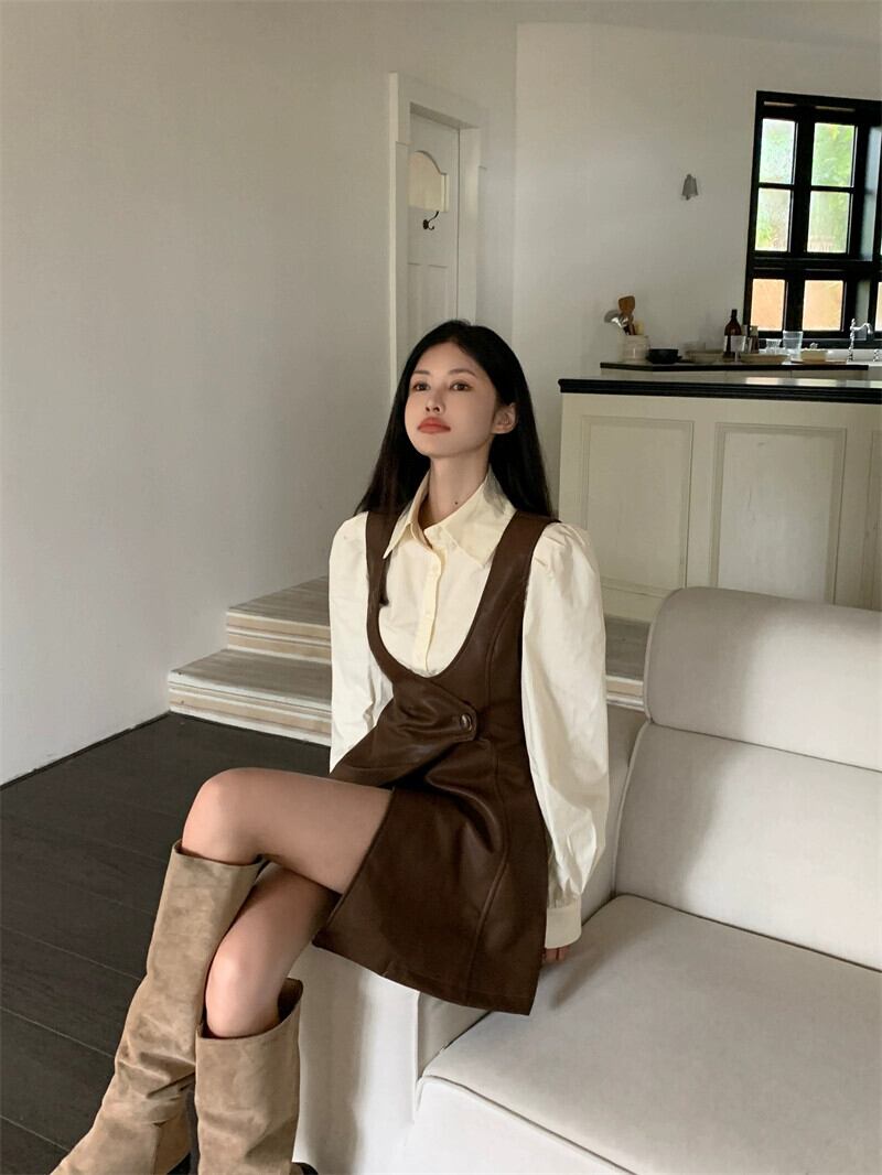 色:アプリコットシャツ,白のシャツ,コーヒー色のレザースカート,黒革のスカート