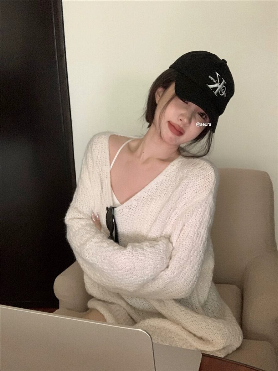 穏やかで怠惰なスタイルの大きな V ネック長袖セーター女性初春着用ルーズ白いセーター中空ブラウストップ ロング ホワイト スプリング 春物 Vネック berry41624009937 | beaute25