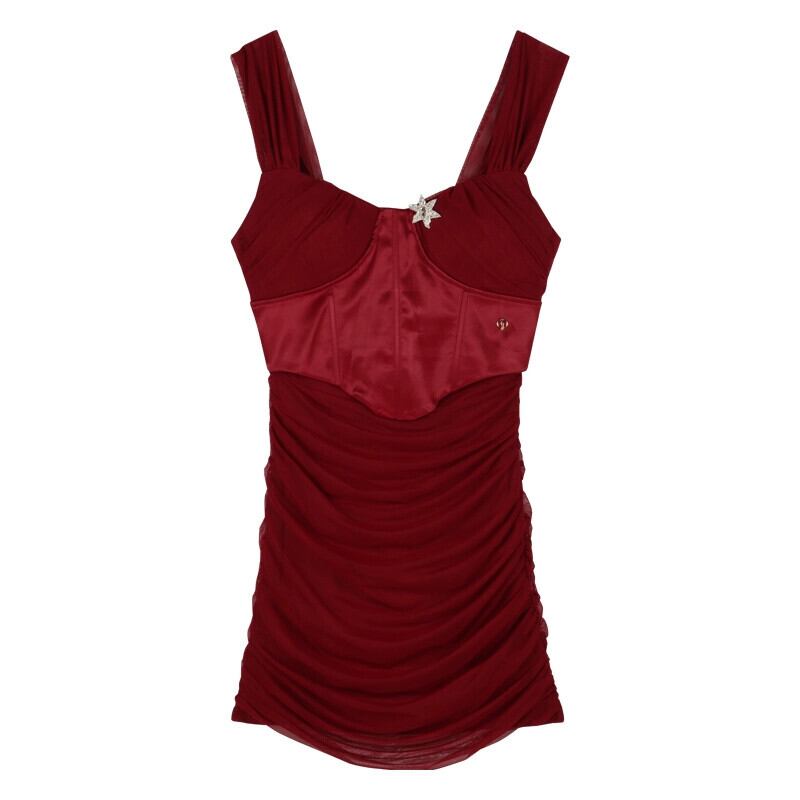 純粋な欲望のセクシーなプリーツバーガンディフィッシュボーンサスペンダードレス女性の夏のウエスト痩身Aラインヒップハグショートスカート サマー 夏物 berry85707669670 | beaute25