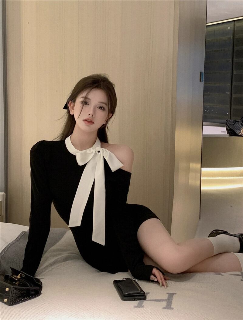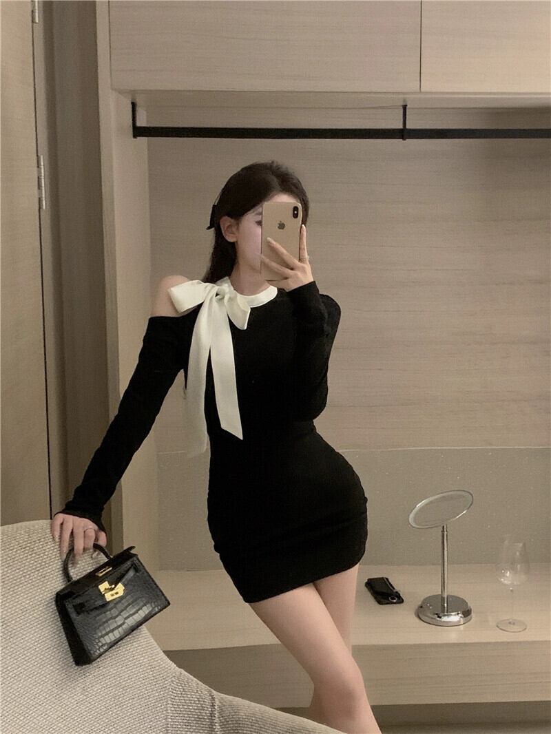 女性の弓長袖ドレス女性の春セクシーなオフショルダースカートウエスト純粋な欲望スタイルヒップハグショートスカート ロング リボン スプリング 春物 ピュア berry8018646051 | beaute25