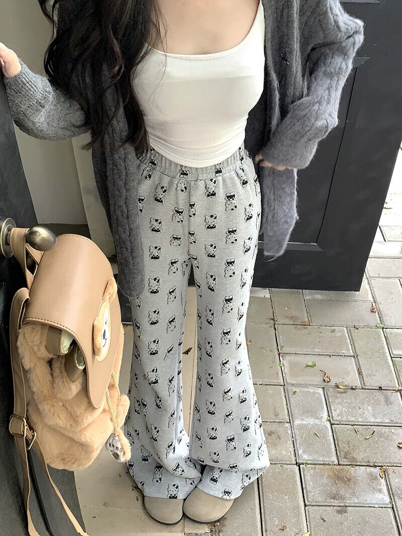 グレーの漫画プリントカジュアルパンツレディース、春ハイウエストフロアレングスパンツ、ウォーキングパンツ、スリムストレート、わずかにフレアパンツ レッド スプリング 春物 berry9389385632 | beaute25