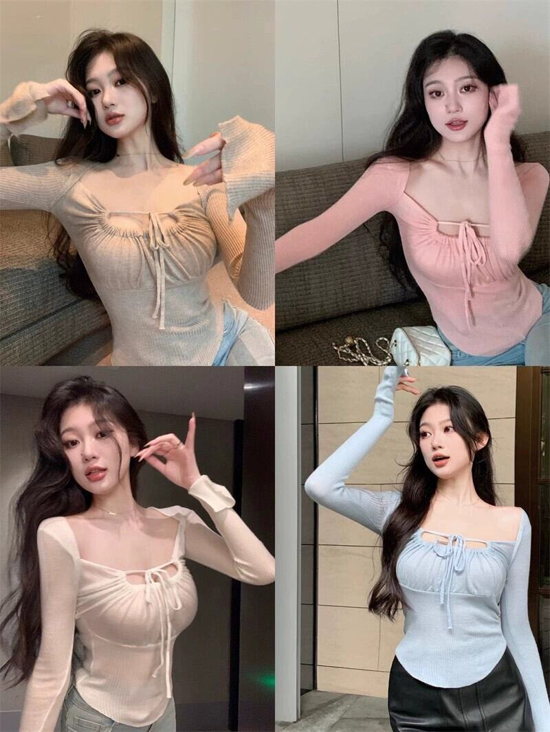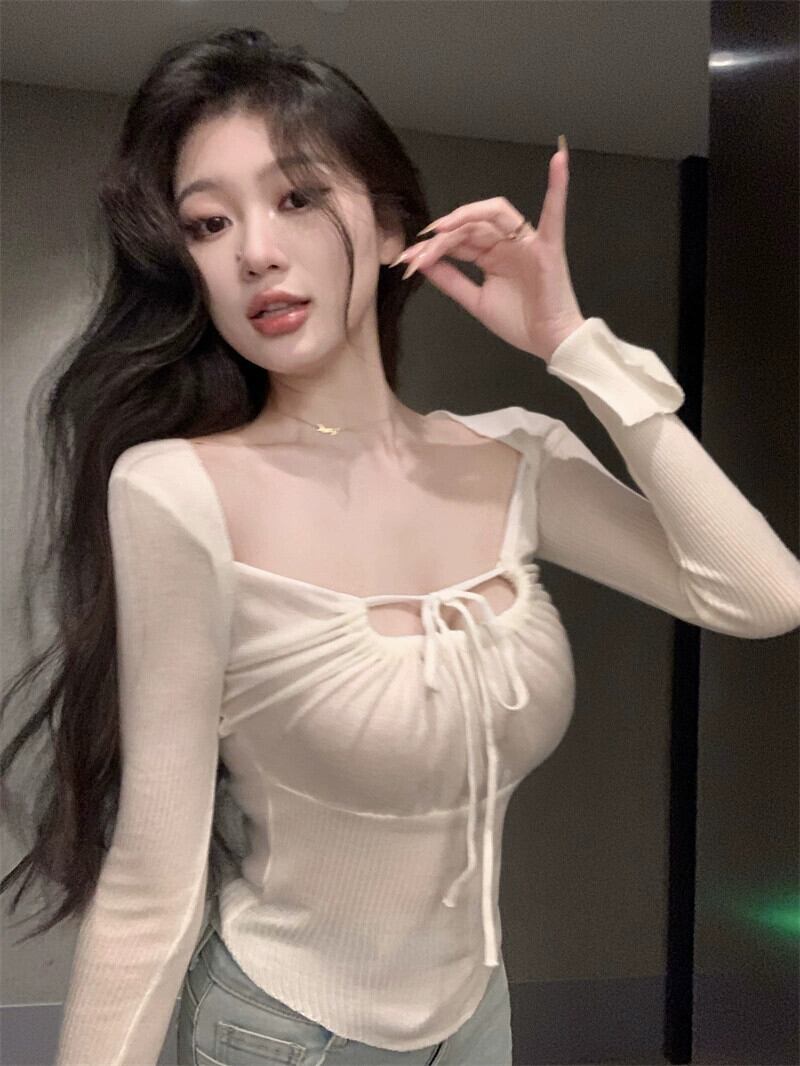 Pure Desire ホワイト スクエアネック 長袖 ニット セーター レディース 春 セクシー ショート ボトリング シャツ 内側にストラップと体型を整えるトップ付き ロング スプリング 春物 スクウェア berry88555629773 | beaute25