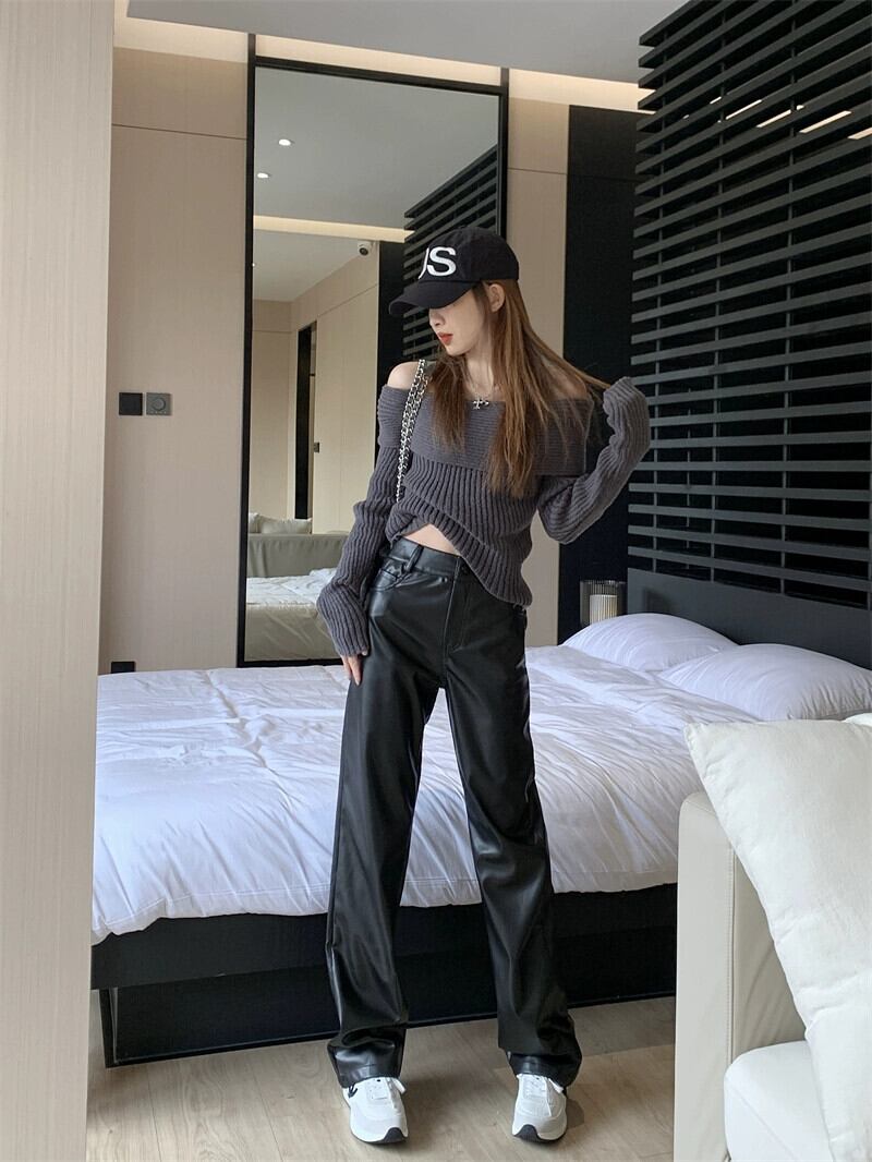 黒 pu レザーストレートレザーパンツ女性春 2024 新スタイルの小さなハイウエストワイドレッグパンツルーズカジュアルパンツ ハイウェスト ブラック スプリング 春物 ワイドパンツ berry18235112277 | beaute25