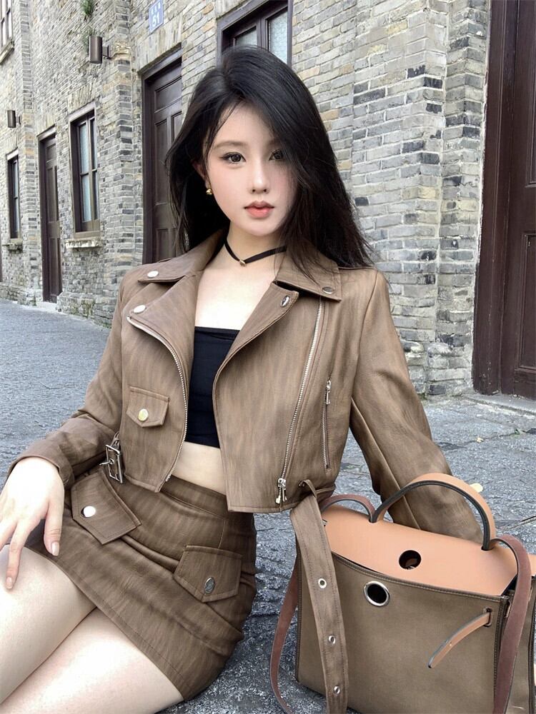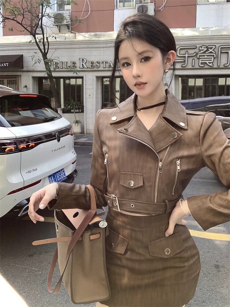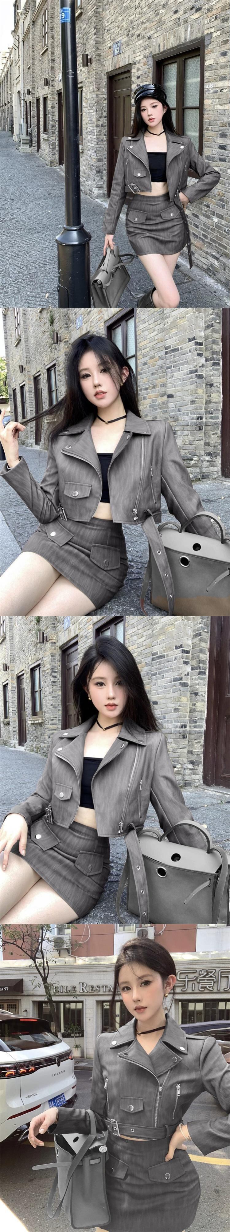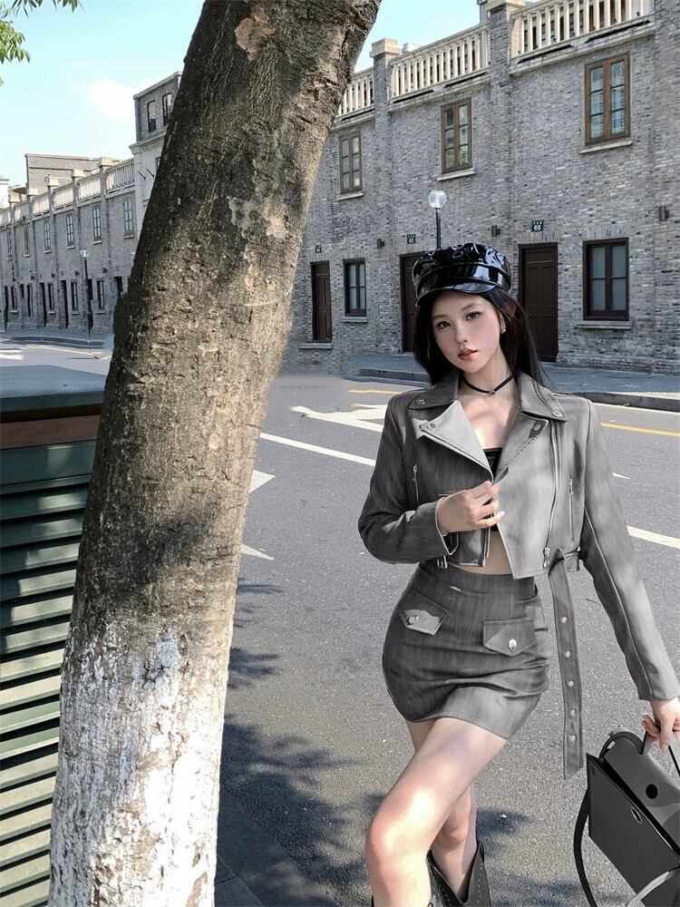 -エンドストリートスーツ、レトロモーターサイクルレザージャケット、レディース春ハイウエストヒップスカート、2点セット ハイウェスト スプリング 春物 berry84362674906 | beaute25