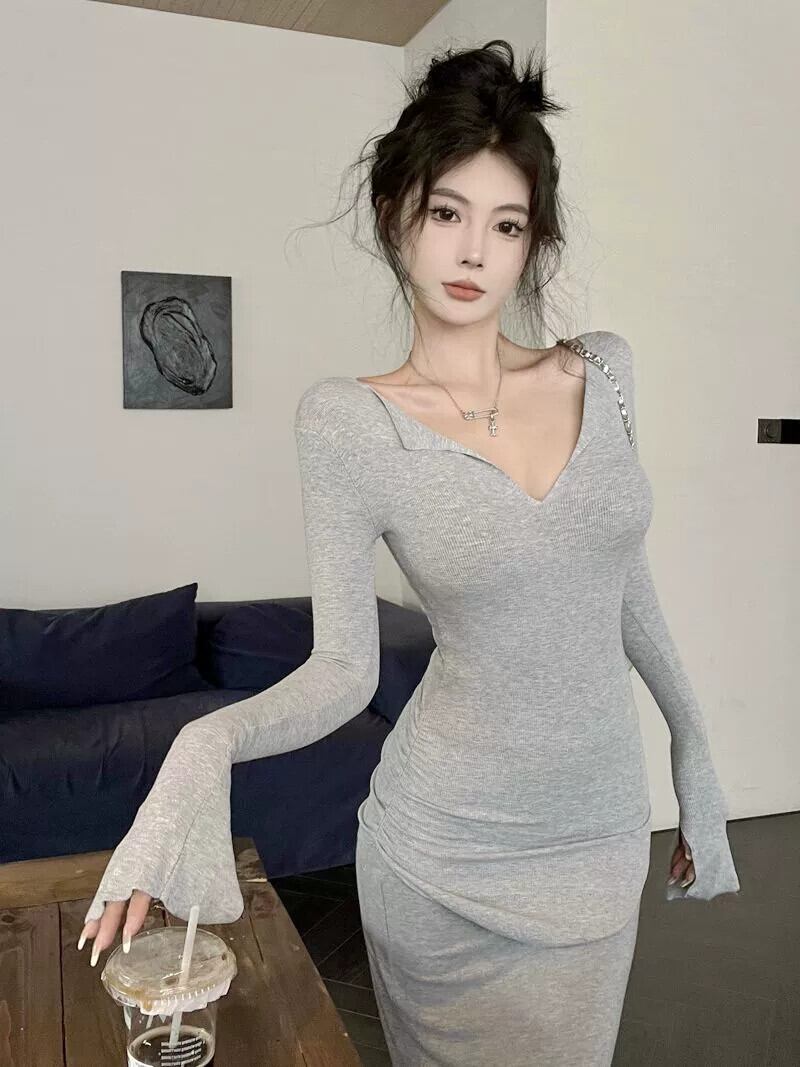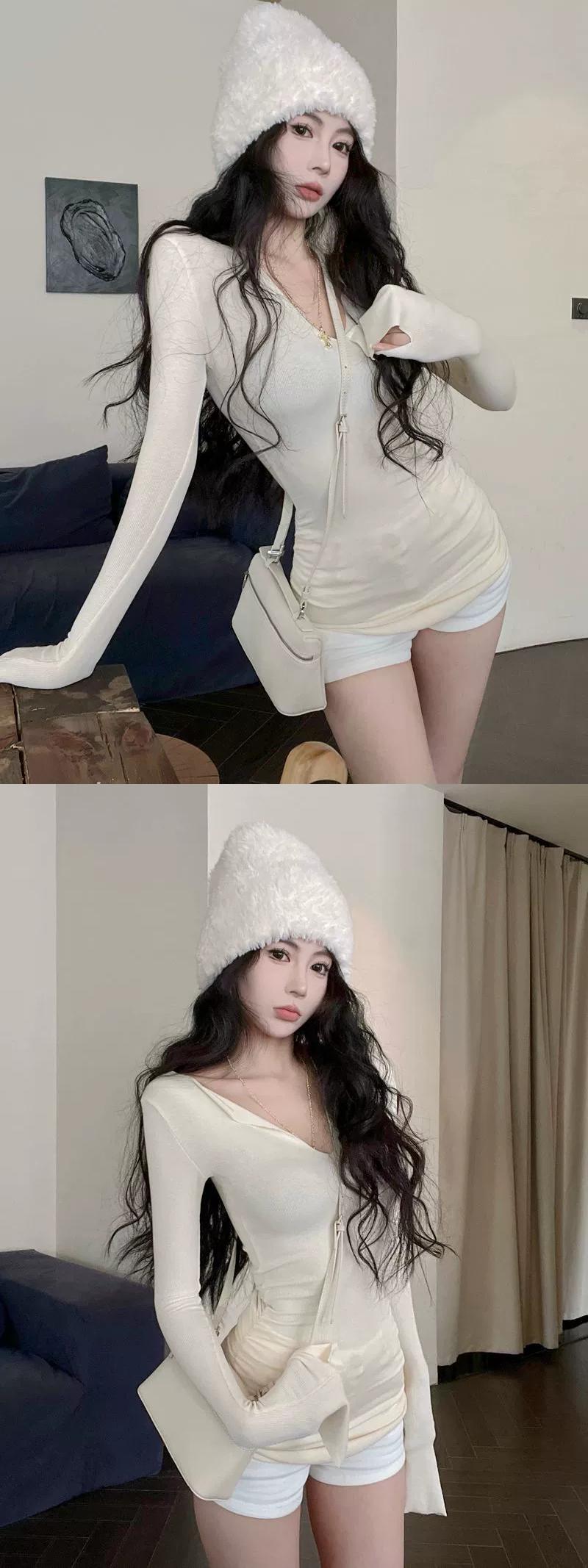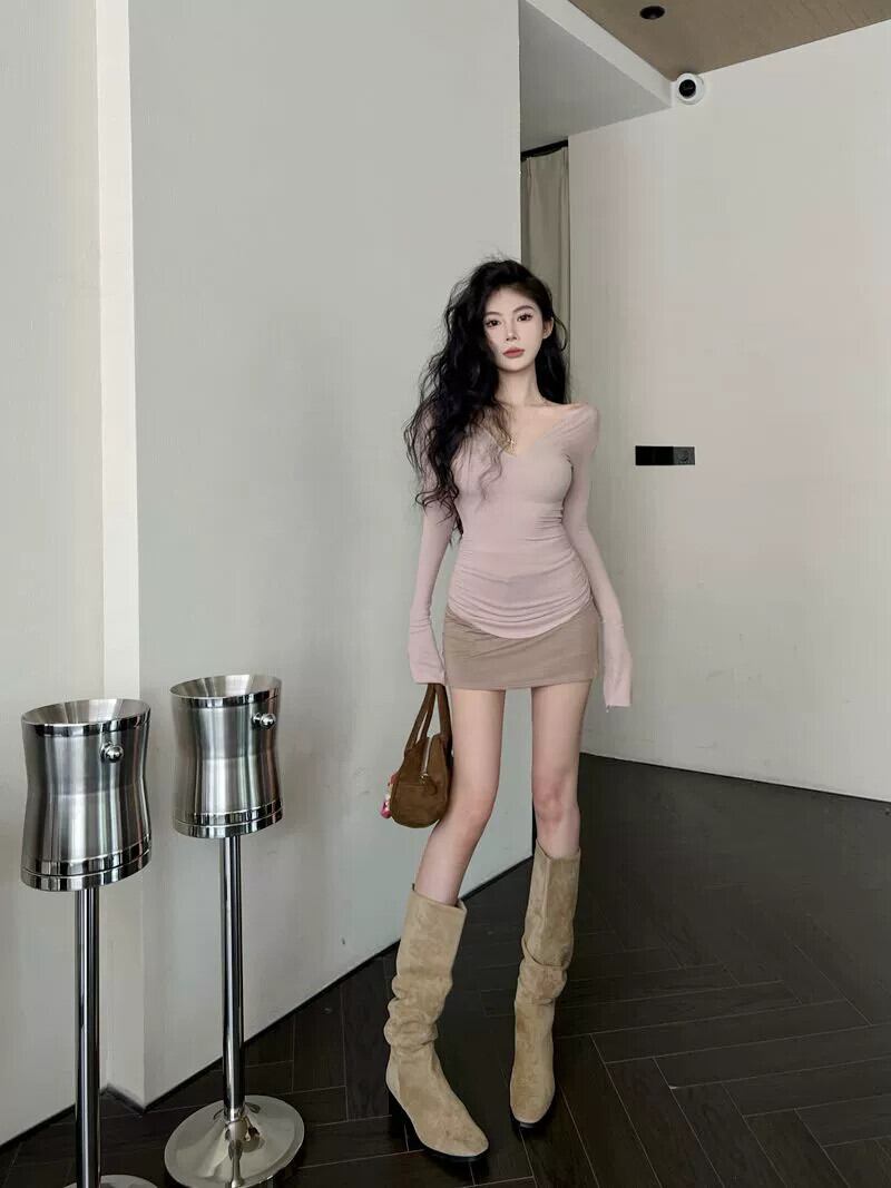 純粋な欲望のセクシーな V ネック長袖 Tシャツ女性春の新スタイル不規則な裾スリムタイトなボトムシャツとインナートップ ロング スプリング 春物 Vネック berry59666875051 | beaute25