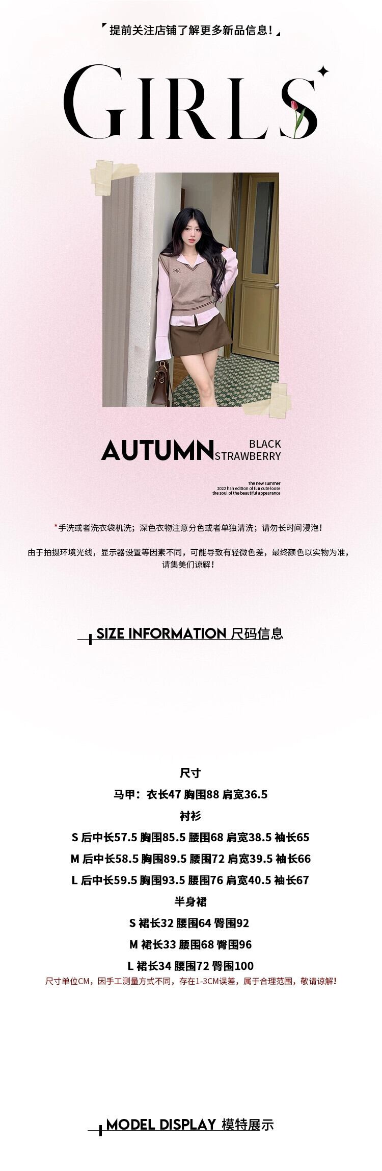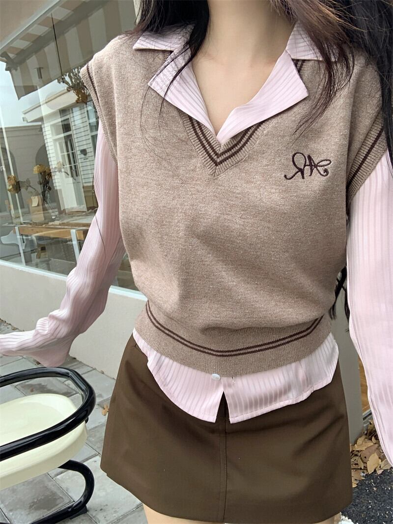 色:ライトフローラルキャメルベスト,はつももピンクシャツ,オリーブブラウンのスカート