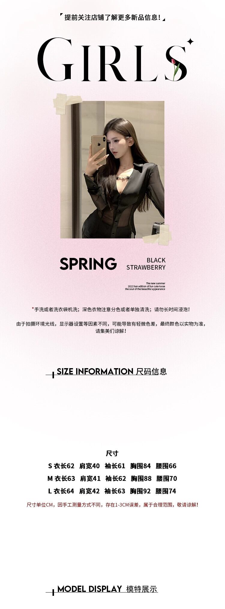 黒の V ネック長袖シャツ女性の春サテンパッチワークウエストシャツ純粋な欲望セクシーなシースルーメッシュトップ ロング ブラック スプリング 春物 Vネック ピュア berry90568990821 | beaute25