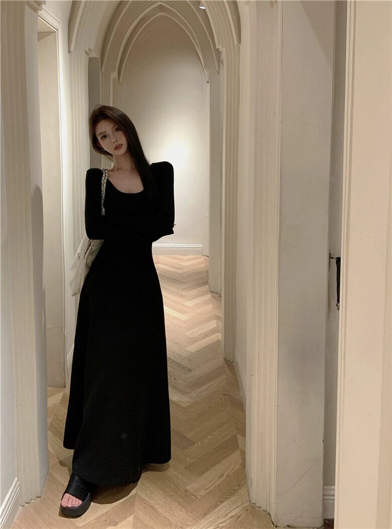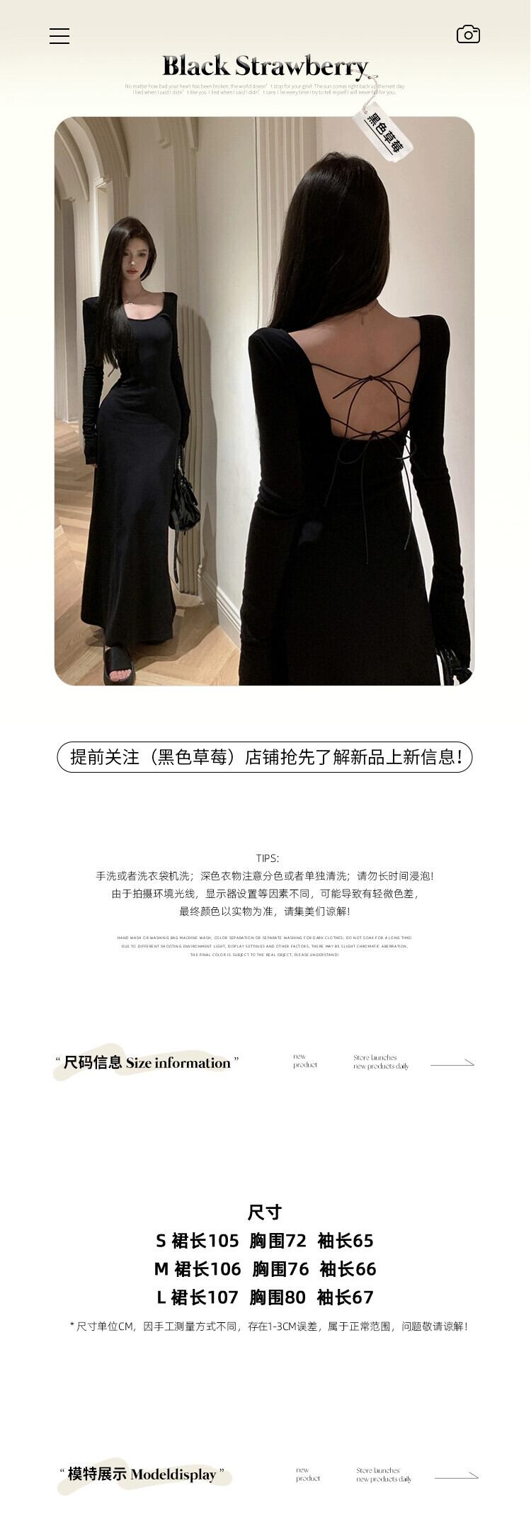 ヘップバーンスタイル長袖ドレス女性春セクシーなバックレスストラップハイエンド黒スカートウエスト A ラインロングスカート ブラック スプリング 春物 Aライン berry42201981357 | beaute25