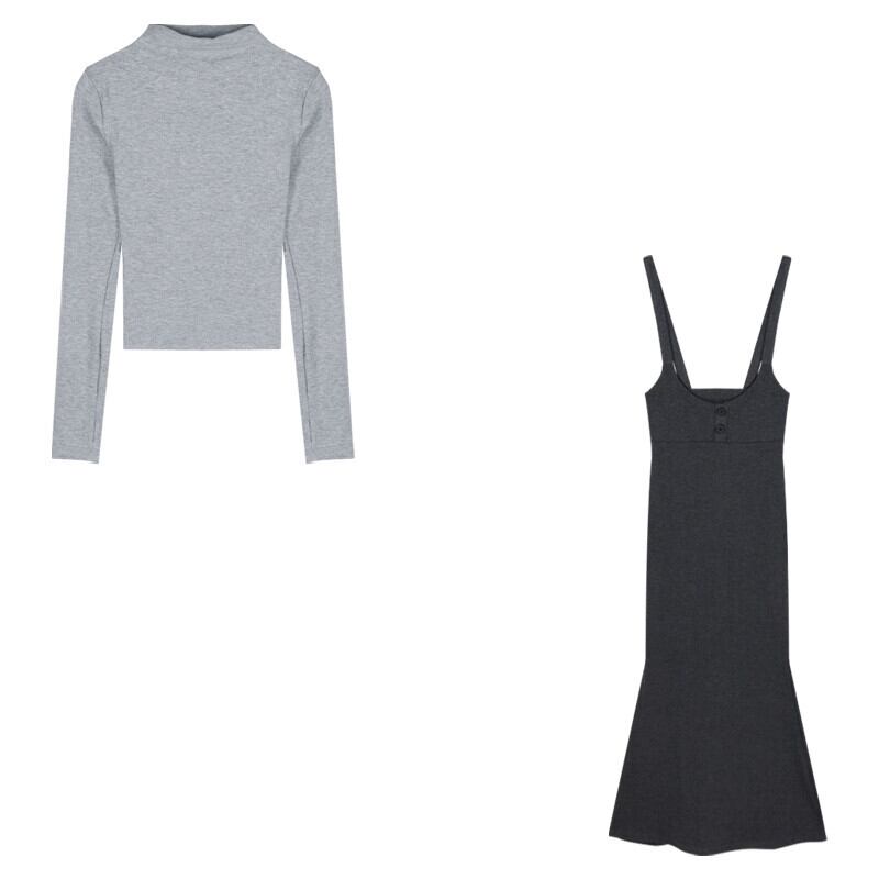 色:グレーのボトミングシャツ,ダークピンクのボトミングシャツ,ダークグレーのサスペンダースカート,コーヒーカラーストラップドレス