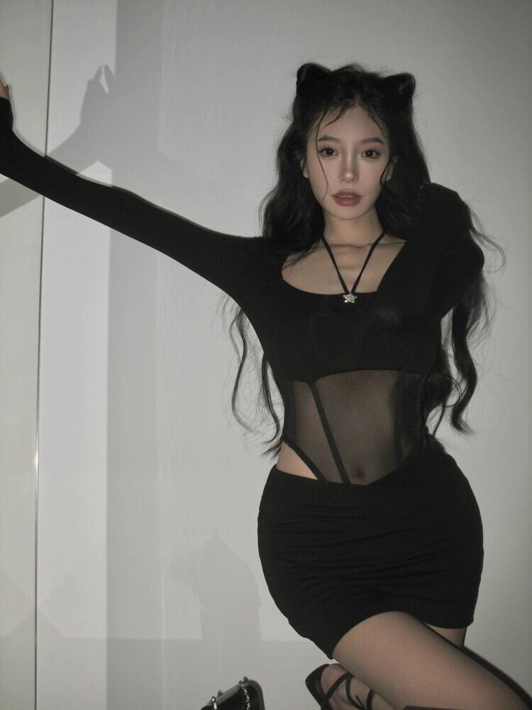 ホットブラックメッシュスプライシング長袖 Tシャツ女性の春ホルターネックセクシーなスリムインナーワンピーストップボトシャツ ロング スプリング 春物 berry11105145009 | beaute25