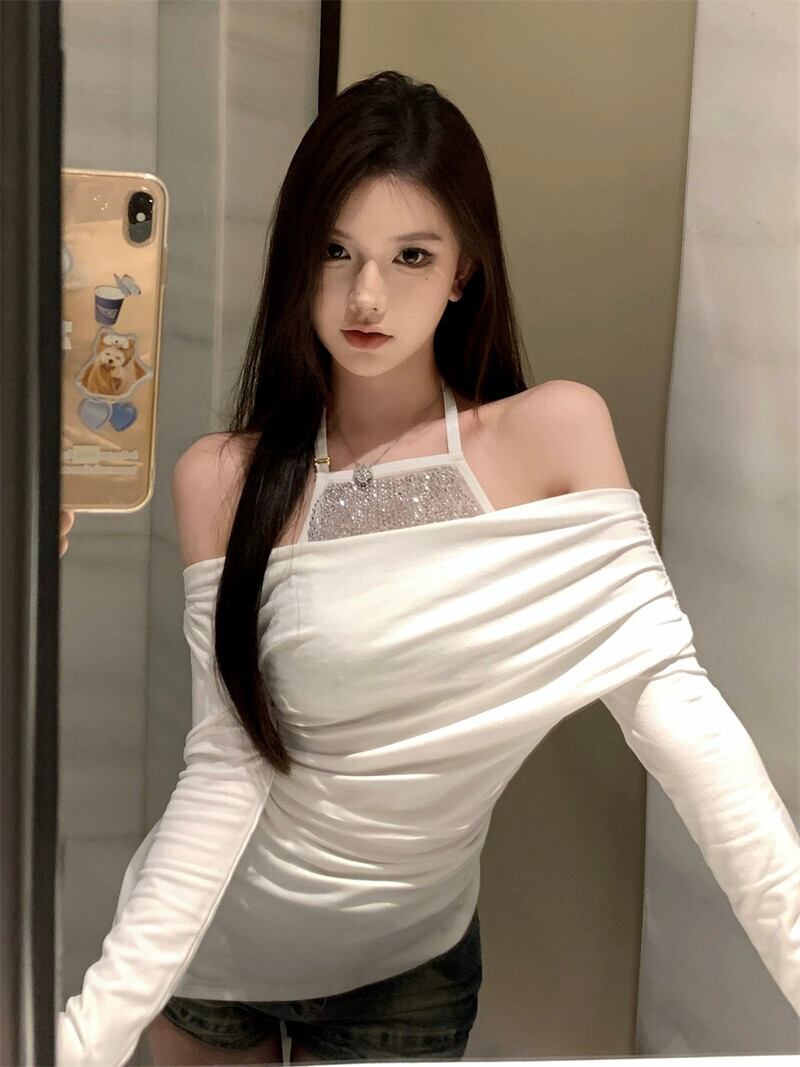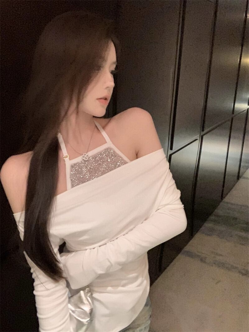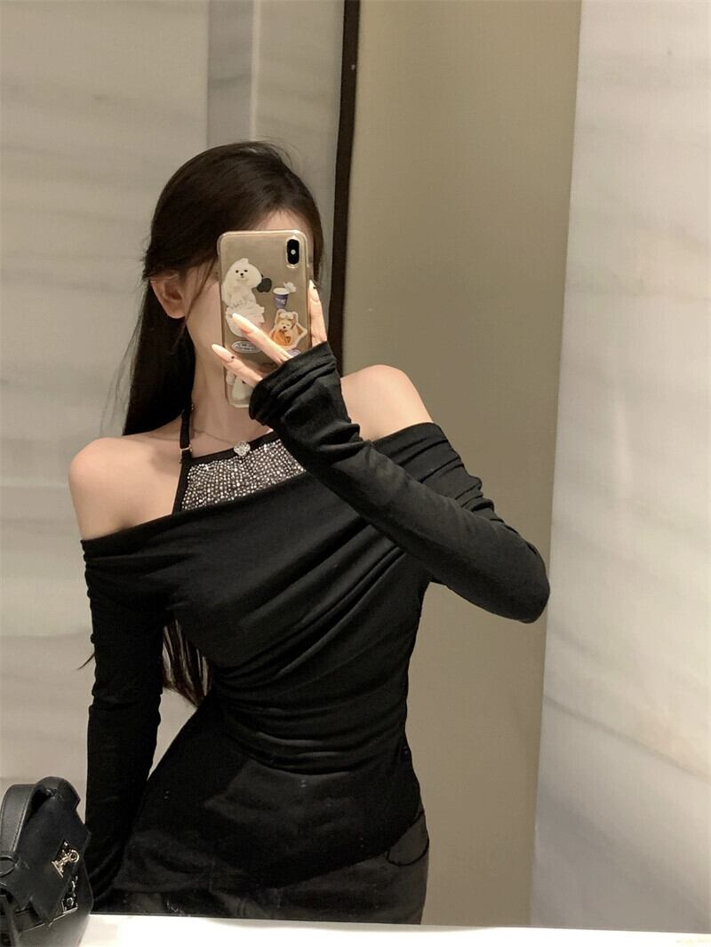 純粋な欲望スタイルのスーツ黒のワンショルダー長袖 T シャツ女性春ダイヤモンド散りばめられたホルターネック ベスト トップ 2 点セット ロング ブラック スプリング 春物 Tシャツ berry84498572892 | beaute25