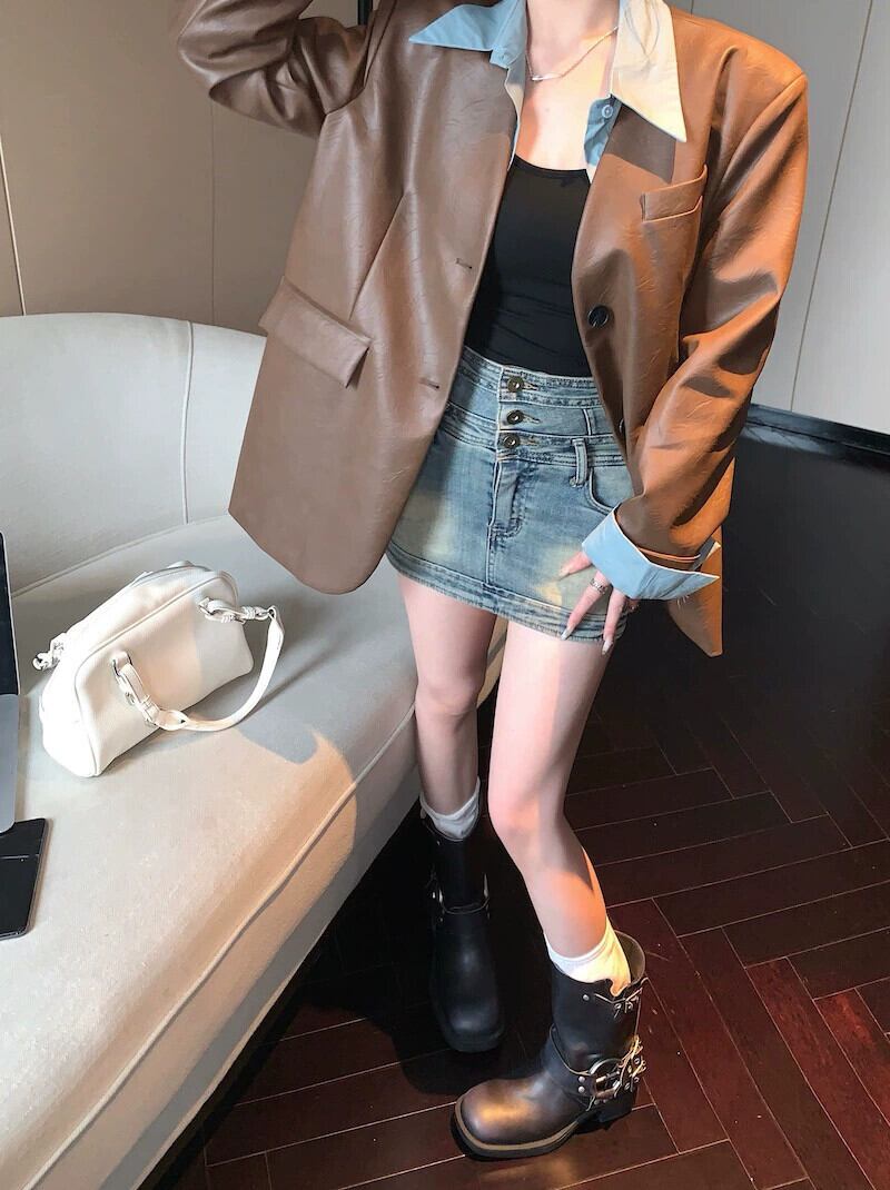 メイラードは、秋と冬のスタイルのルーズなシルエットのスーツのデザインの対照的なカーディガントップのPUレザージャケットの女性を着ています オータム 秋物 ウィンター 冬物 berry64226683357 | beaute25