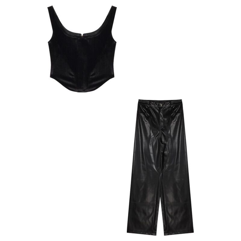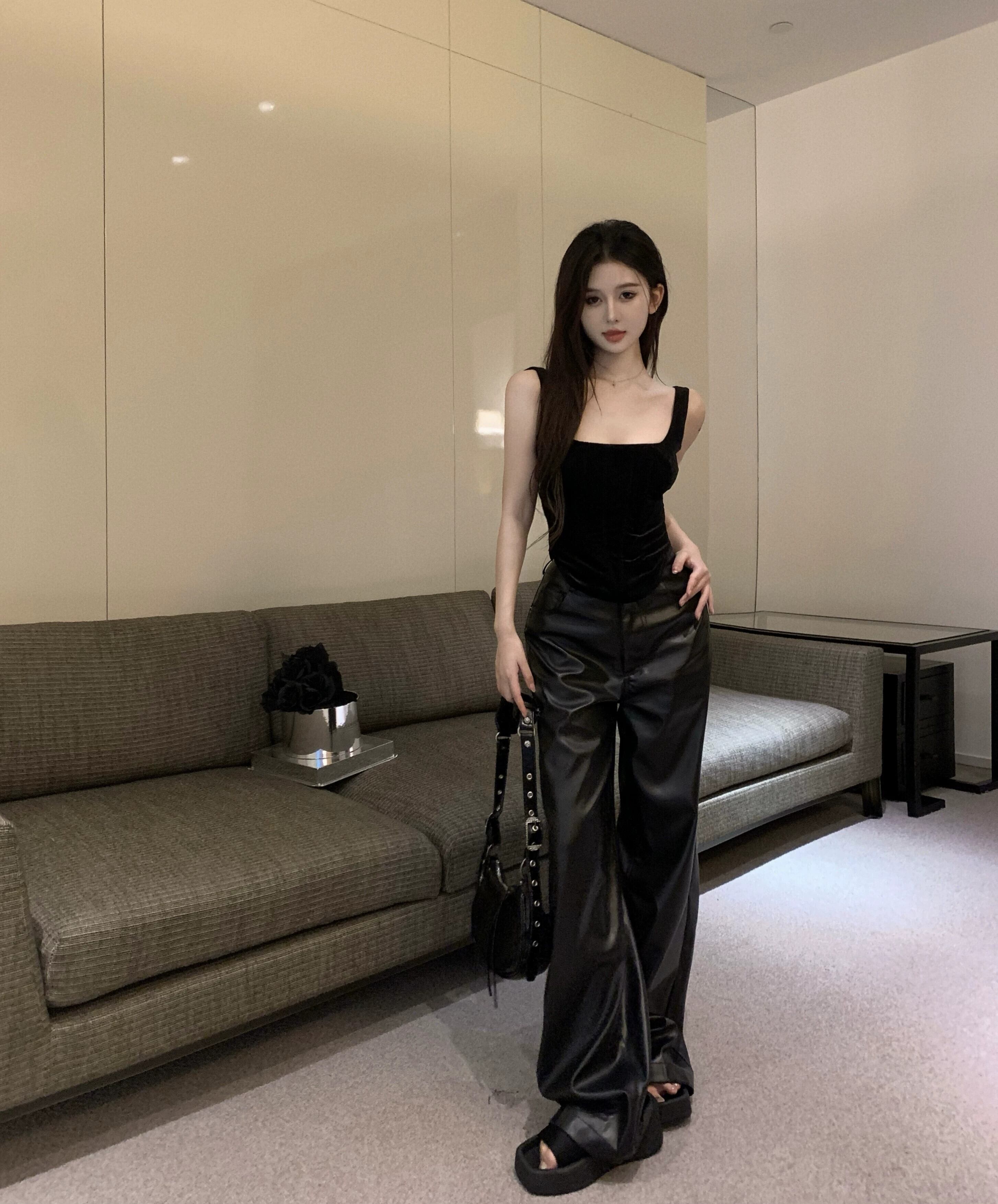 色:黒革パンツ,ベルベットフィッシュボーンベスト