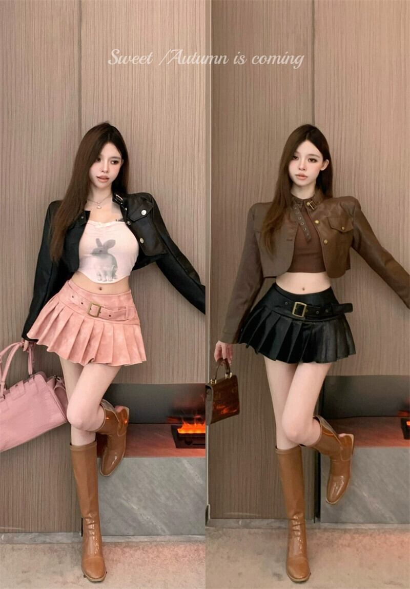 春のピンクのハイウエストプリーツスカートレディース、露出防止キュロット、ヒップカバー痩身スカート、PUレザースカート、Aラインショートスカート スプリング 春物 berry60604569682 | beaute25