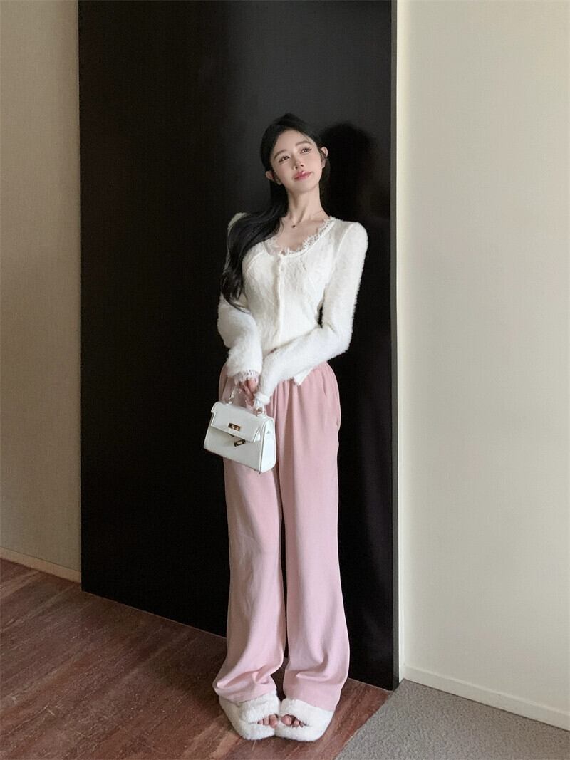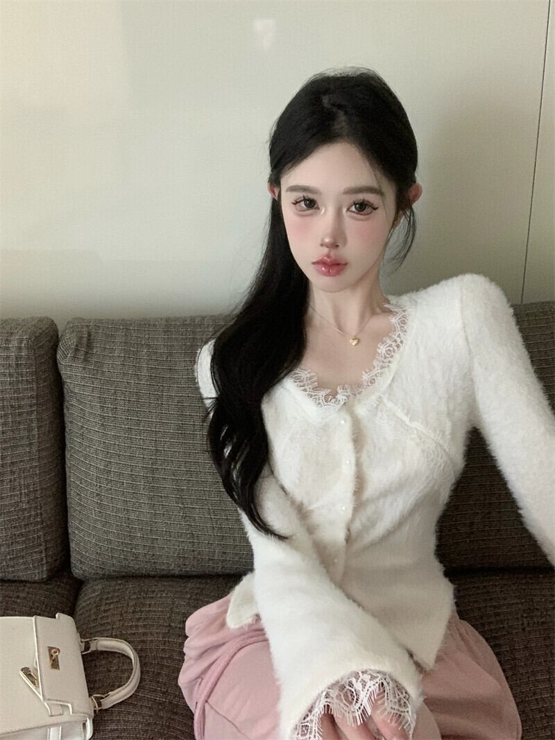 イミテーションミンクファーレース長袖 V ネックニットカーディガントップ女性の秋と冬の純粋な欲望スタイルスリムショートセーター ロング オータム 秋物 ウィンター 冬物 Vネック ピュア berry81408419288 | beaute25