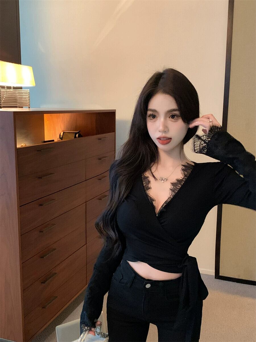 レーススプライシングクロスストラップ V ネック Tシャツレディース春長袖ボトリングシャツ純粋な欲望スタイル黒ショートインナートップ ロング ブラック スプリング 春物 Vネック ピュア berry50042546501 | beaute25