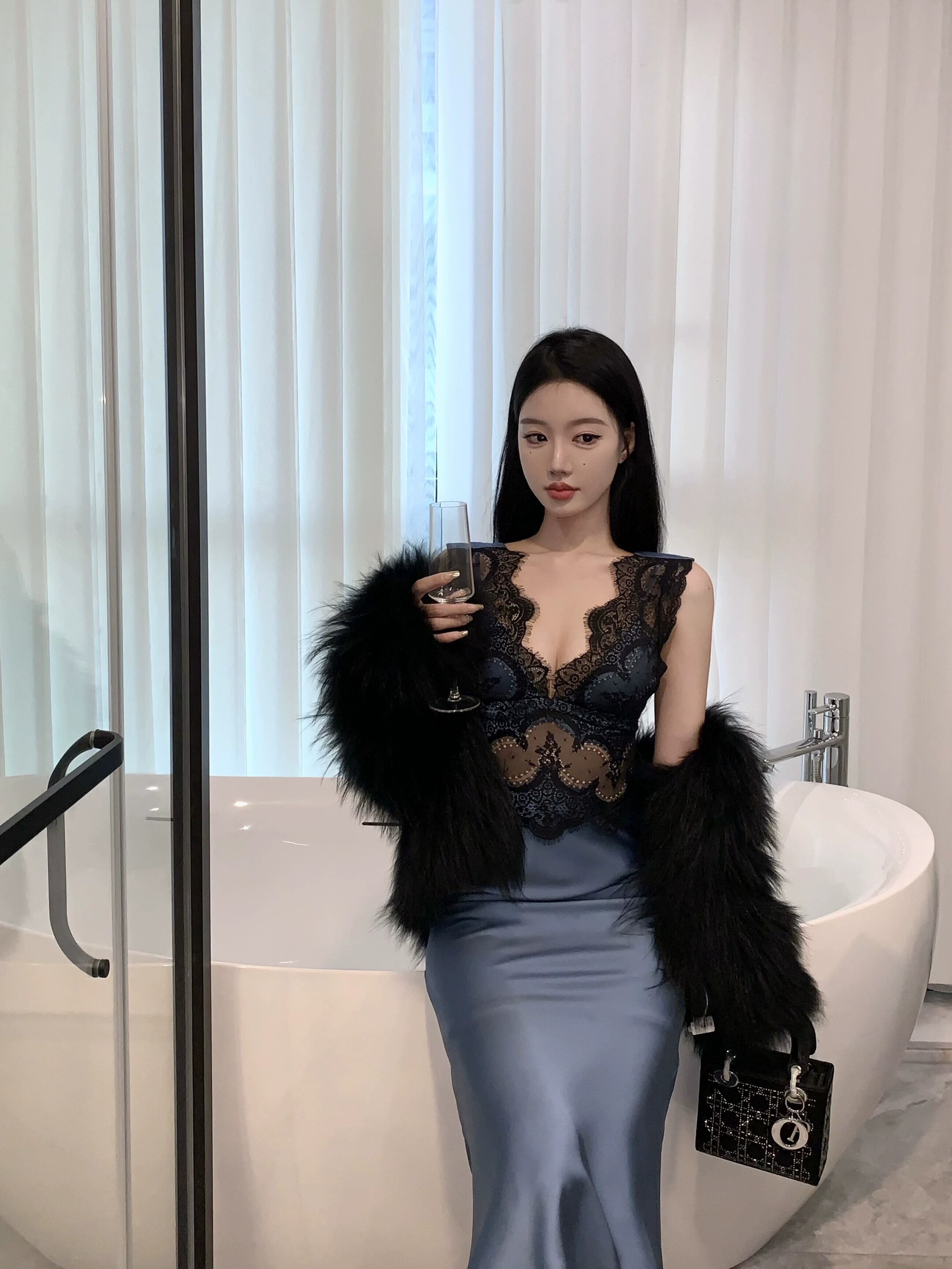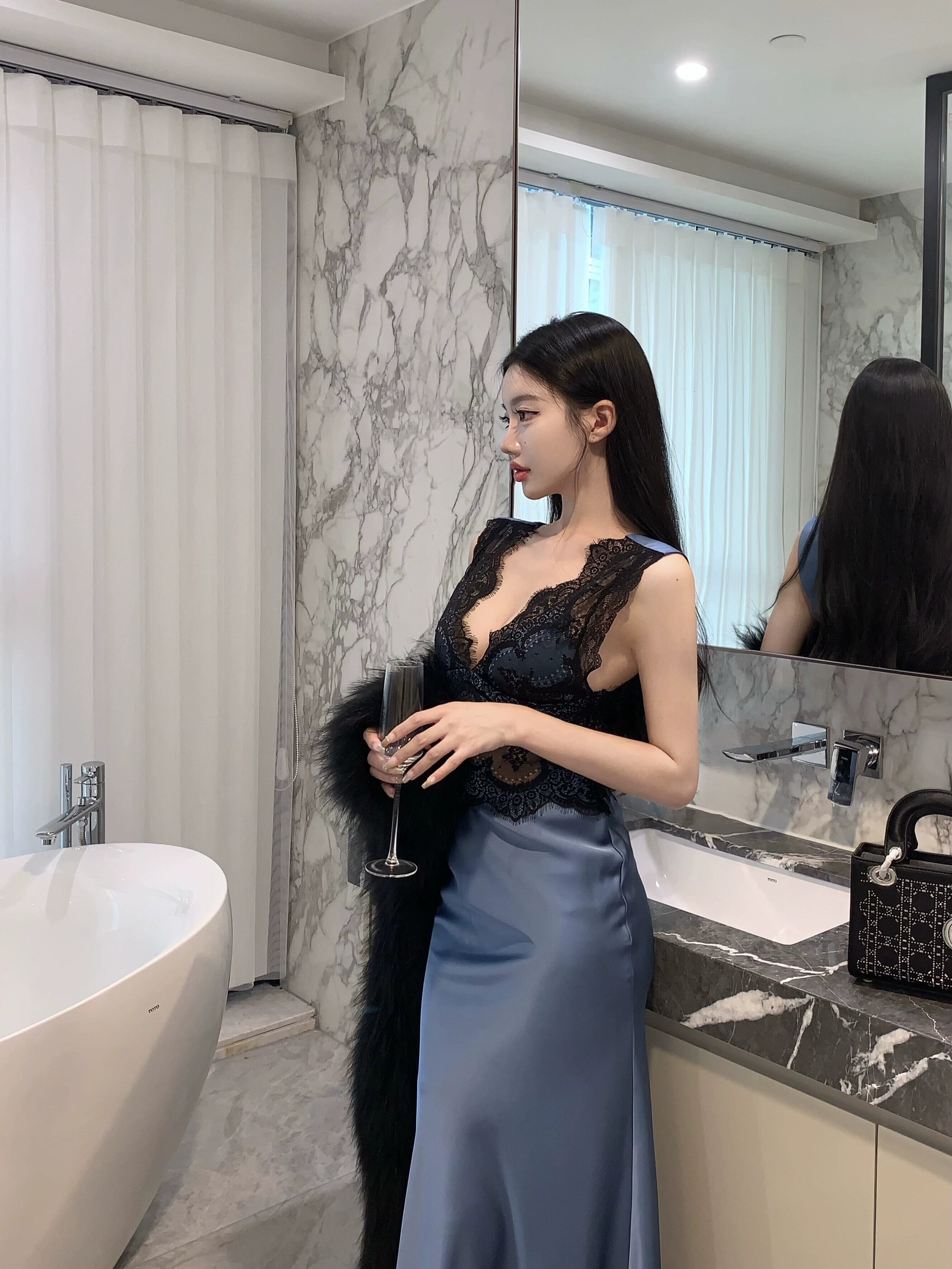 レーススプライシングサテン v ネックベストドレス女性の夏のウエストウエストセクシーなセクシーなヒップスカートミッドレングススカート サマー 夏物 Vネック berry82296614783 | beaute25