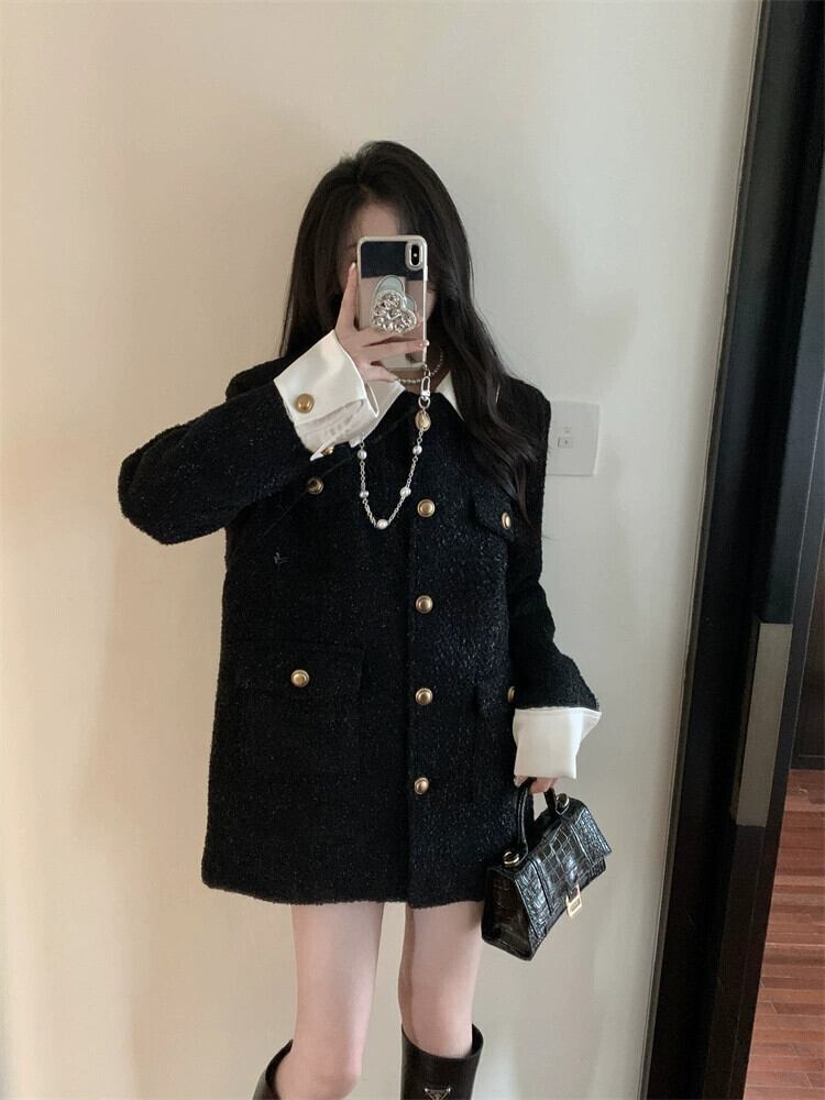 フレンチスタイルの小さな香り明るいシルクウールコート女性の秋と冬のハイエンドブラックステッチミッドレングスウールコート オータム 秋物 ウィンター 冬物 berry46046960913 | beaute25